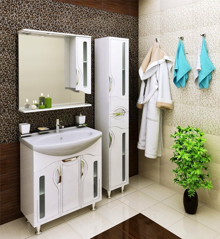 Тумба под раковину Runo Толедо 00000001039. Тумба под умывальник напольная с тремя распашными фасадами со стеклянной вставкой и одной внутренней полкой. Петли со встроенным доводчиком, ручки врезные- 3шт, ножки хром - 2шт, ножки пластик -2шт.