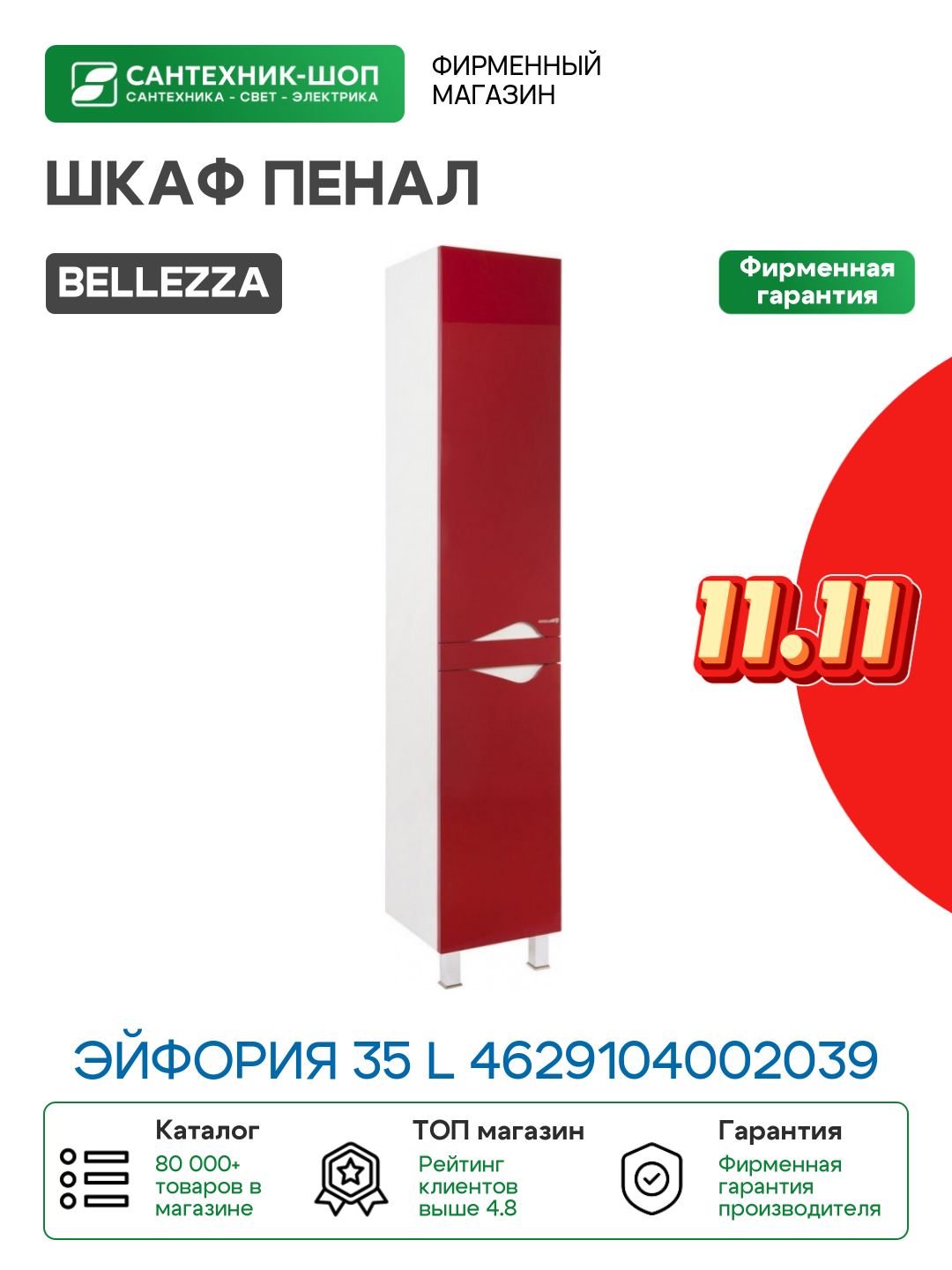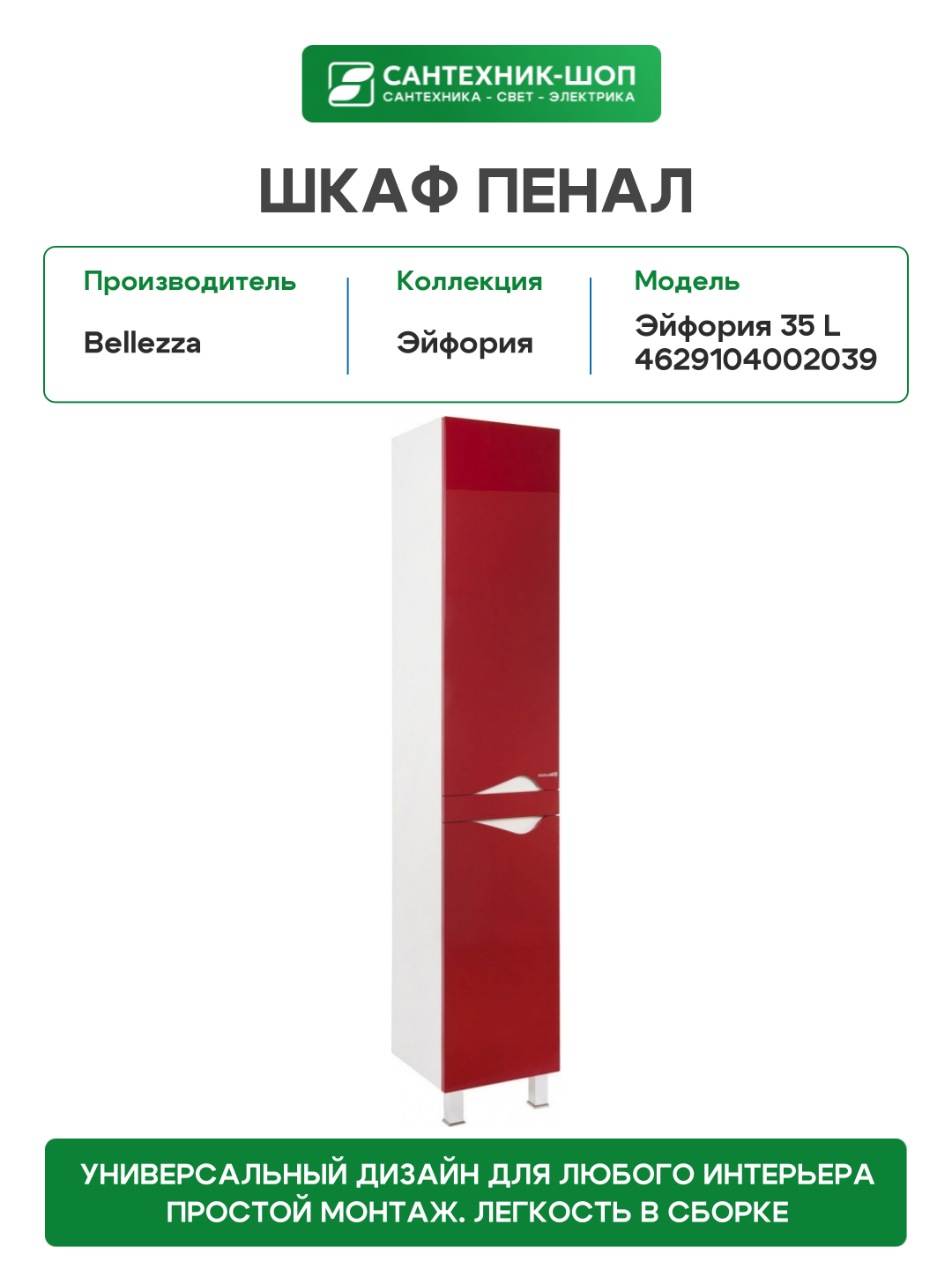 Шкаф-пенал Bellezza Эйфория 35 L. Артикул: 4629104002039. Цвет: красный.Станет отличным функциональным решением для небольшой ванной комнаты. Прекрасно дополнит интерьер и подарит комфорт и уют. - Ориентация: левая.- Изготовлен из влагостойких МДФ/ДСП с четырехслойным лаковым покрытием (Италия). Материалы устойчивы к повышенной влажности, перепадам температур, развитию грибков и микроорганизмов.- Две распашные дверцы с доводчиками для плавного и бесшумного закрывания.- Вкладные полочки.- Габариты (ШхВхГ): 35x190x34 см.- Монтаж: на ножках. В комплекте поставки: шкаф-пенал.