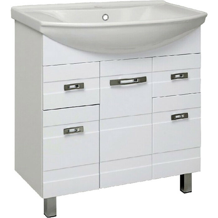 Тумба под умывальник на ножках с тремя распашными фасадами и двумя боковыми выдвижными ящиками. За центральным фасадом -одна внутренняя полка. Петли со встроенным доводчиком, ящики на шариковых направляющих полного выдвижения, ручки - 5 шт, ножки хром - 2 шт, ножки пластик - 2 шт.