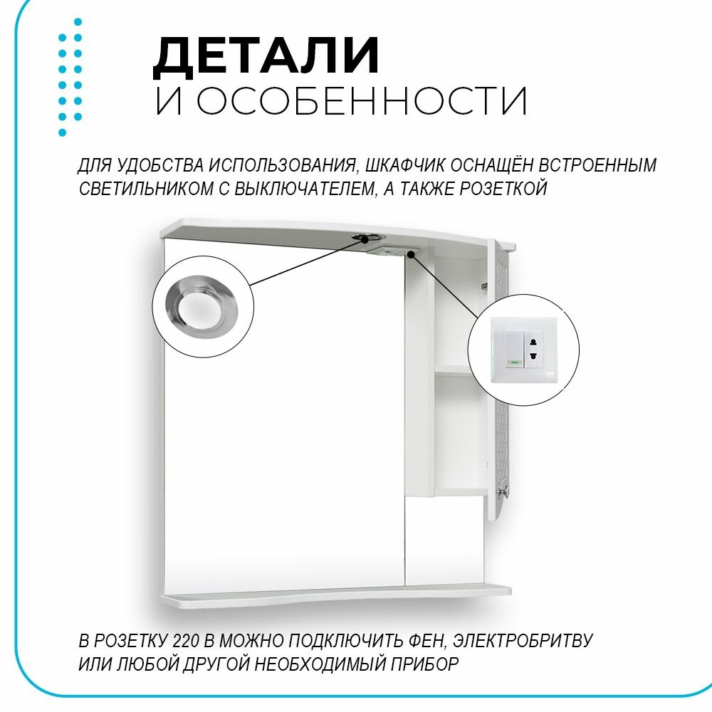 Зеркальный шкаф для ванной Runo Малано УТ000002098 правый. Зеркальный шкаф для ванной оборудован одним врезным светодиодным светильником 220В и розеткой с выключателем. Справа - шкафчик с распашной дверцей и одной внутренней полкой. Под зеркалом - нижняя полка. Петли со встроенным доводчиком, ручка - 1шт. Выпускается только в правом исполнении.