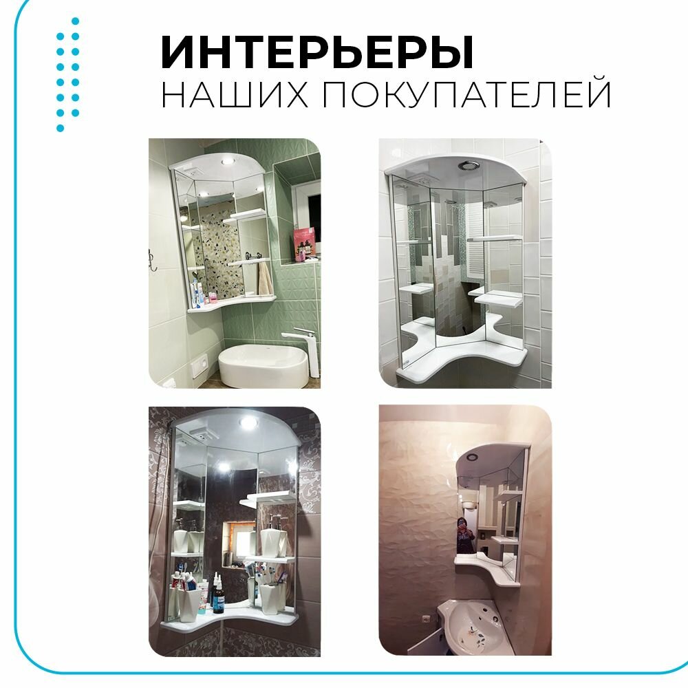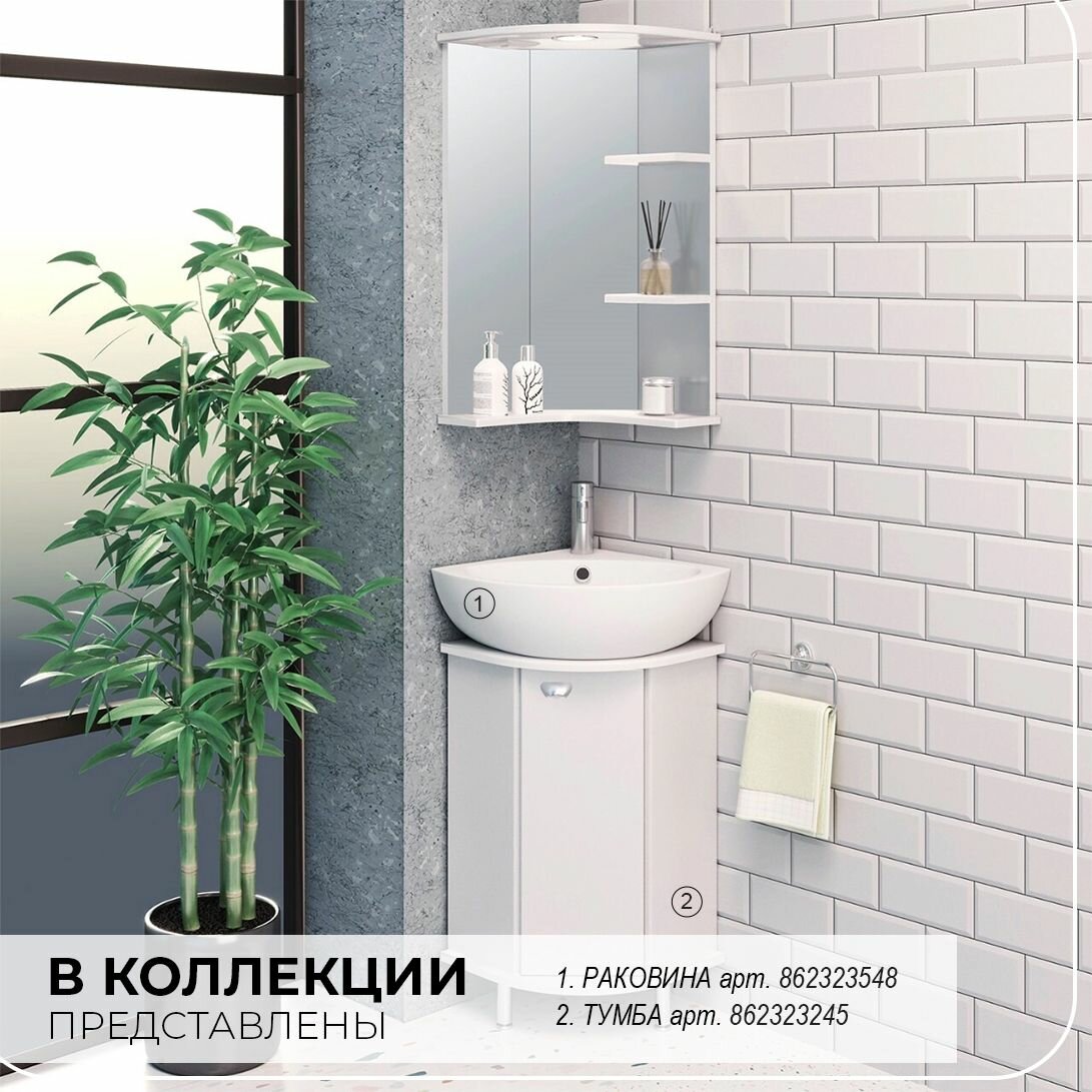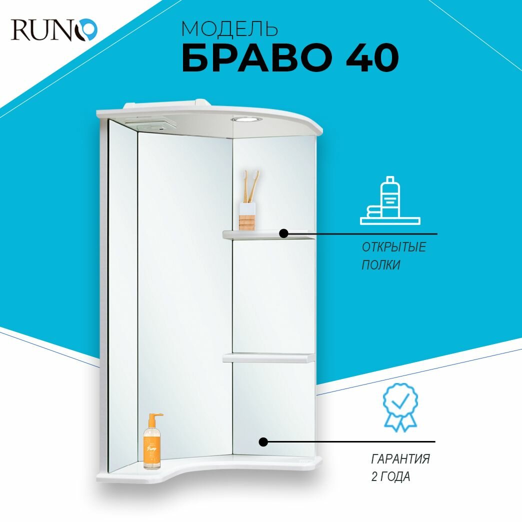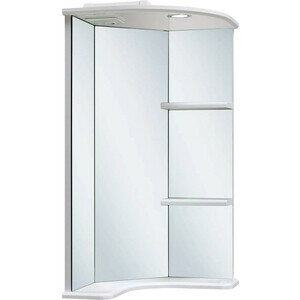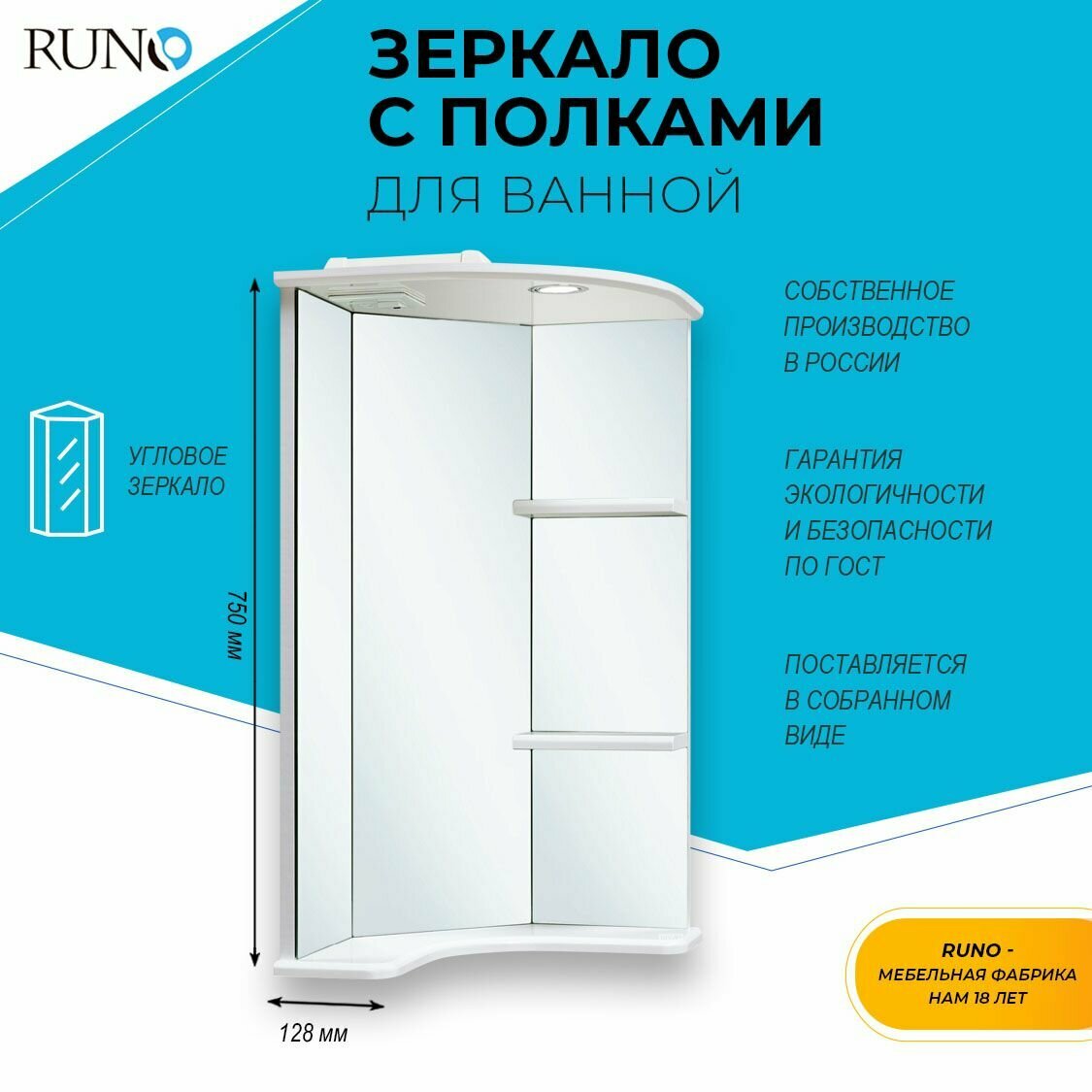 Зеркало Runo Браво 00000000949 угловое. Зеркало настенное Runo Браво (угловое) - функциональное решение для недорогого и современного оснащения ванной комнаты. Зеркало для ванной оборудовано козырьком, нижней полкой, двумя открытыми полочками (справа), а также одним врезным светодиодным светильником 220 В и розеткой с выключателем. Мебель для ванной RUNO - красота и практичность в мелочах! Зеркало с подсветкой , полка для ванной , зеркало с подсветкой в ванную , полка в ванную , полки для ванной , зеркало в ванную с подсветкой , мебель для ванной комнаты , угловое зеркало , угловая полка
