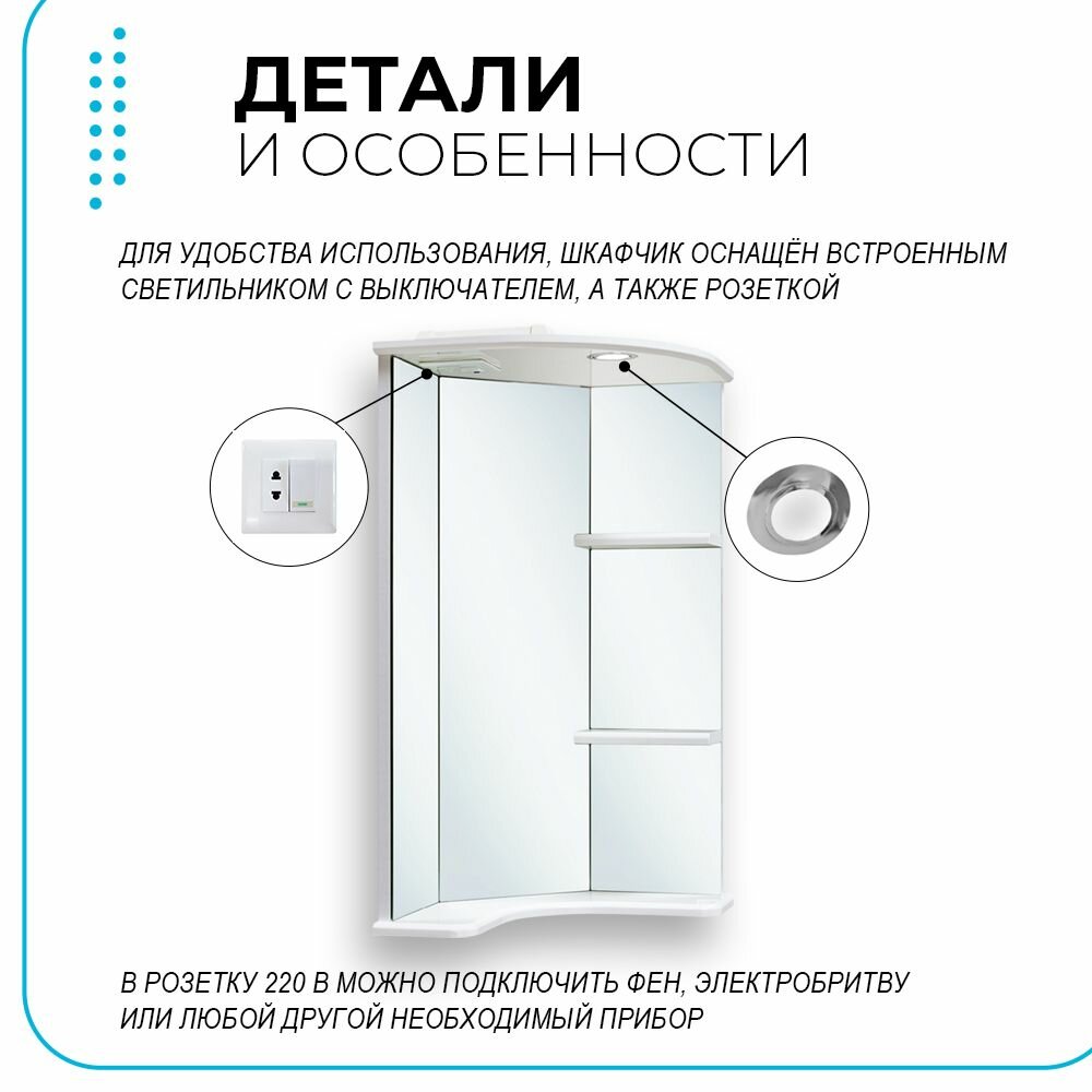 | Оснащение зеркала | С розеткой, с подсветкой, с полкой, с выключателем |