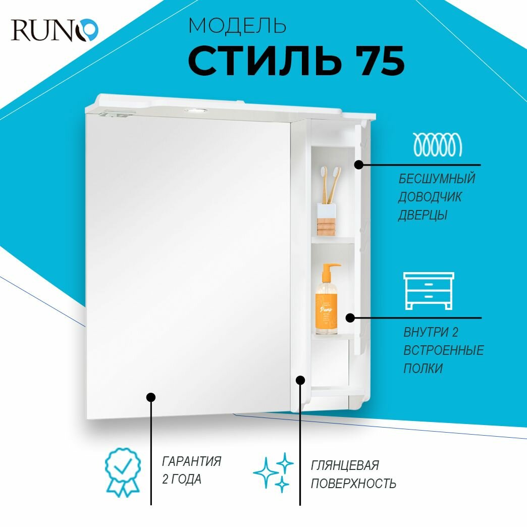 Зеркальный шкаф для ванной Runo Стиль 00000001128 правый. Зеркальный шкаф для ванной оборудован одним врезным светодиодным светильником 220В и розеткой с выключателем. Справа - шкафчик с распашной дверцей и одной внутренней полкой. Под шкафом - открытая полочка. Петли со встроенным доводчиком. Выпускается только в правом исполнении.