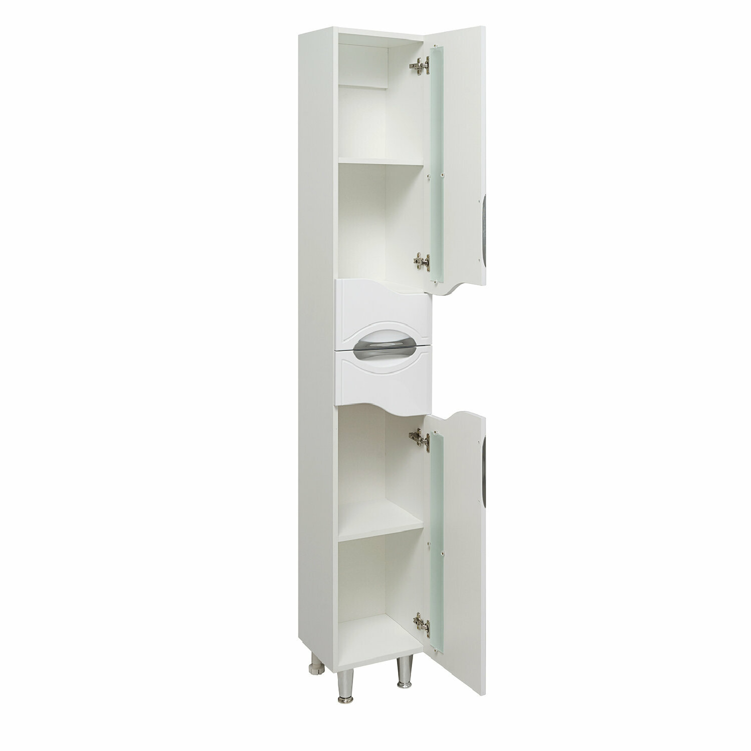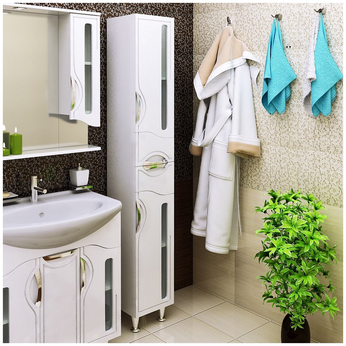 Пенал для ванной Runo Толедо 00000001037 правый. Шкаф-колонна напольный с двумя распашными дверками и выдвижными ящиками. Дверцы со стеклянными вставками. В нижнем и верхнем отделениях - по одной внутренней полке. Петли со встроенным доводчиком, ручки врезные - 4шт, ножки хром -2шт, ножки пластик -2шт. Выпускается только в правом исполнении.