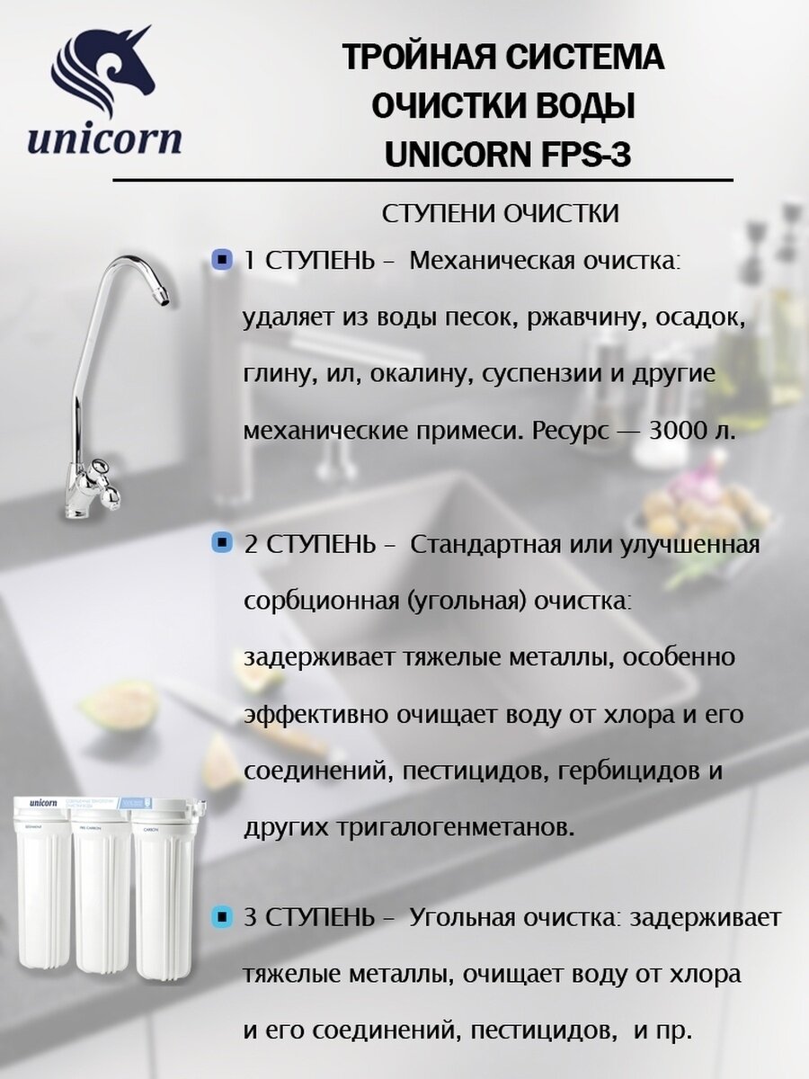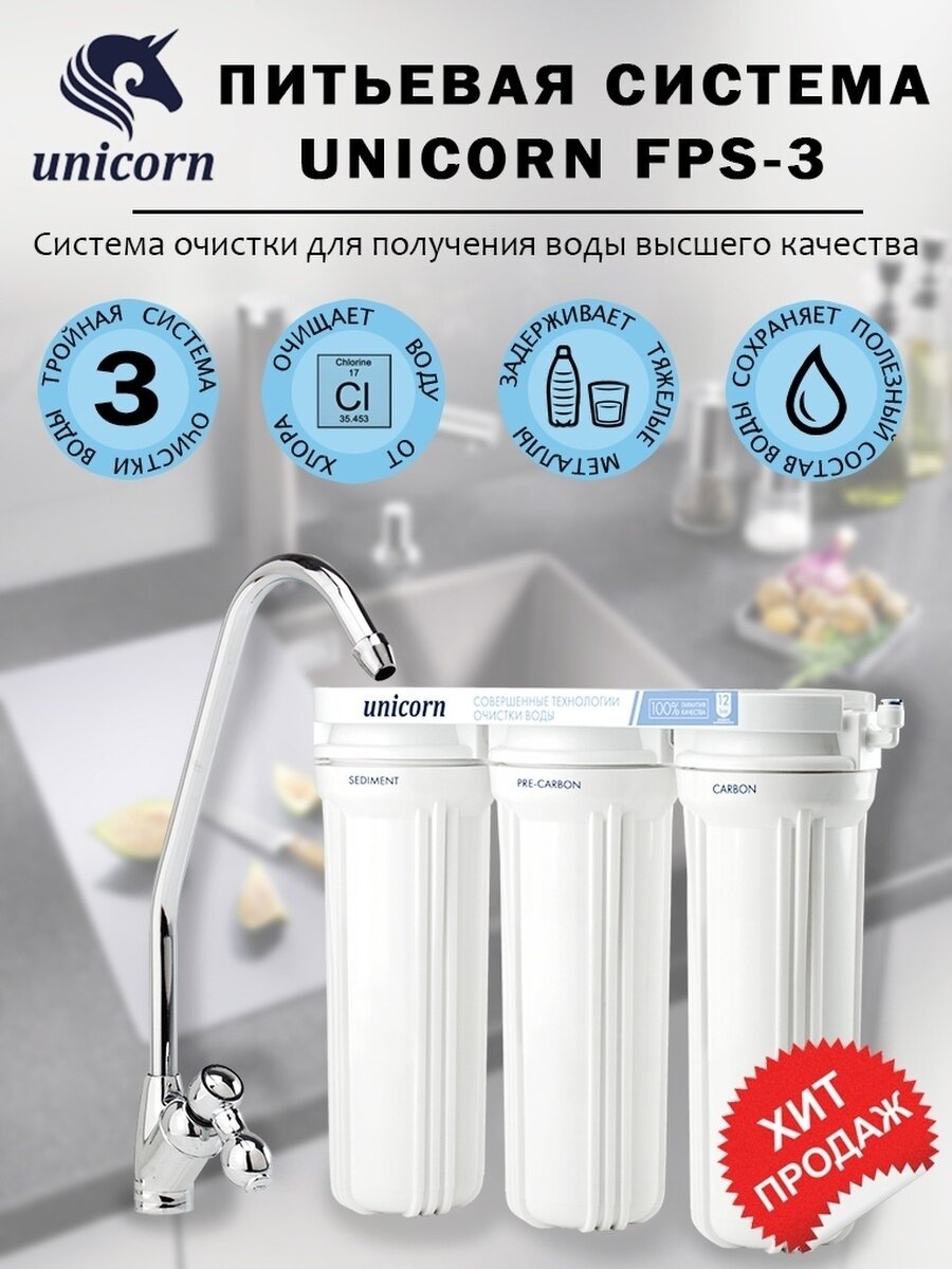 Сервис сравнения цен СкидкаГИД предлагает сравнить цены на товар «Трехступенчатая система фильтрации Unicorn FPS-3 ST для питьевой воды умягчение с краном и картриджами»
