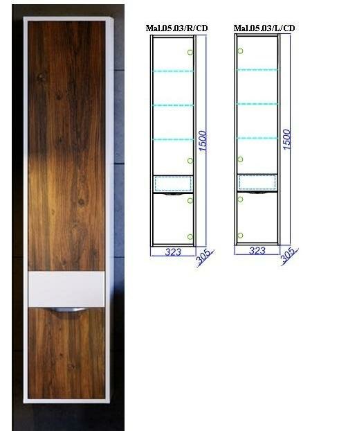 Шкаф пенал Aqwella 5 Stars Malaga 30 Mal.05.03/R/CD имеет превосходный минималистичный дизайн, великолепно сочетающийся в современном интерьере ванных комнат. Пенал имеет верхиее отделение с механизмом открывания push-to-open: , шкаф открывается посредством легкого нажатия на крышку фасада, а также два нижних выдвижных ящика. Внутри верхнего отделения пенала размещенны три стеклянных полочки для удобного расположения косметики