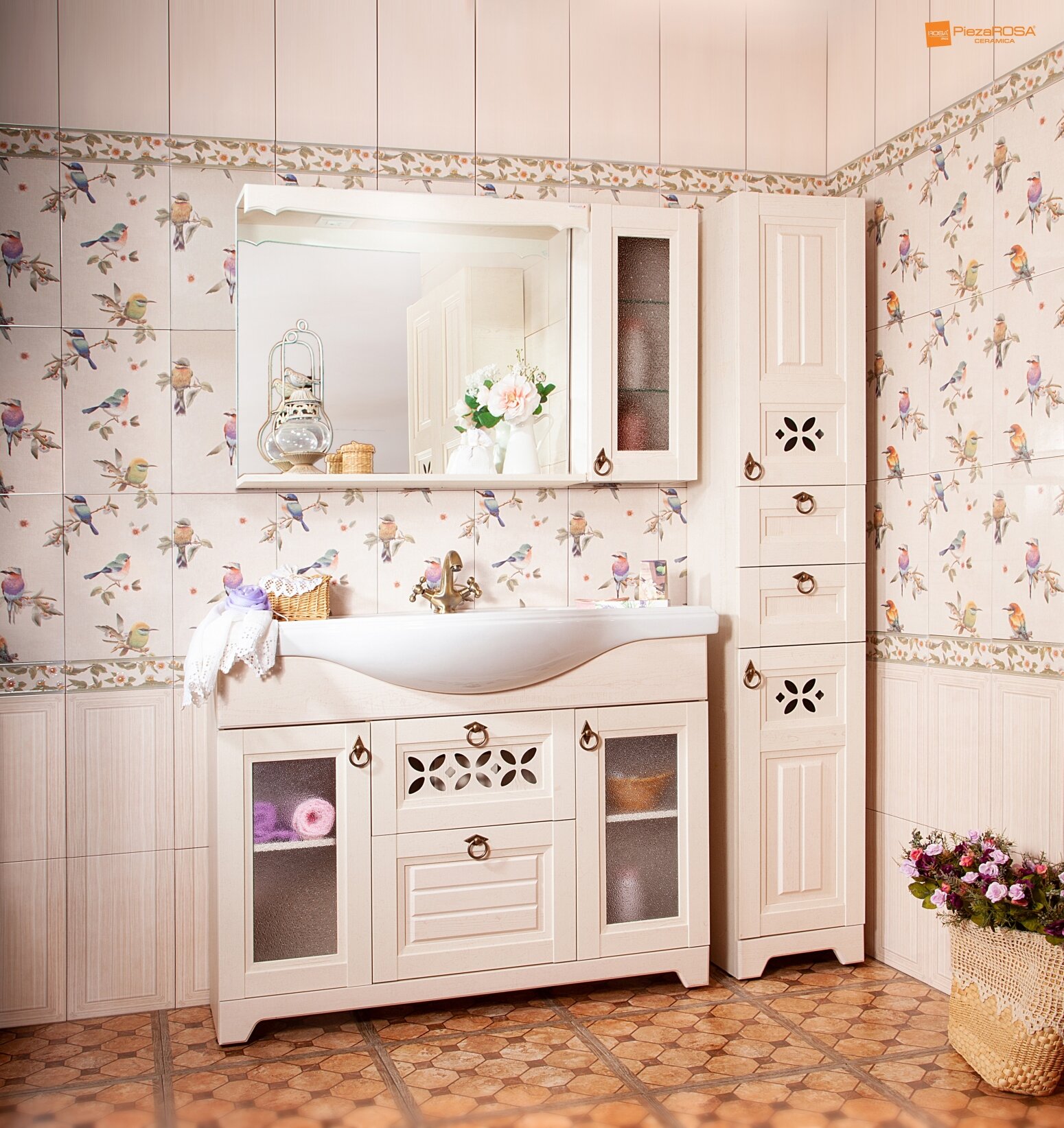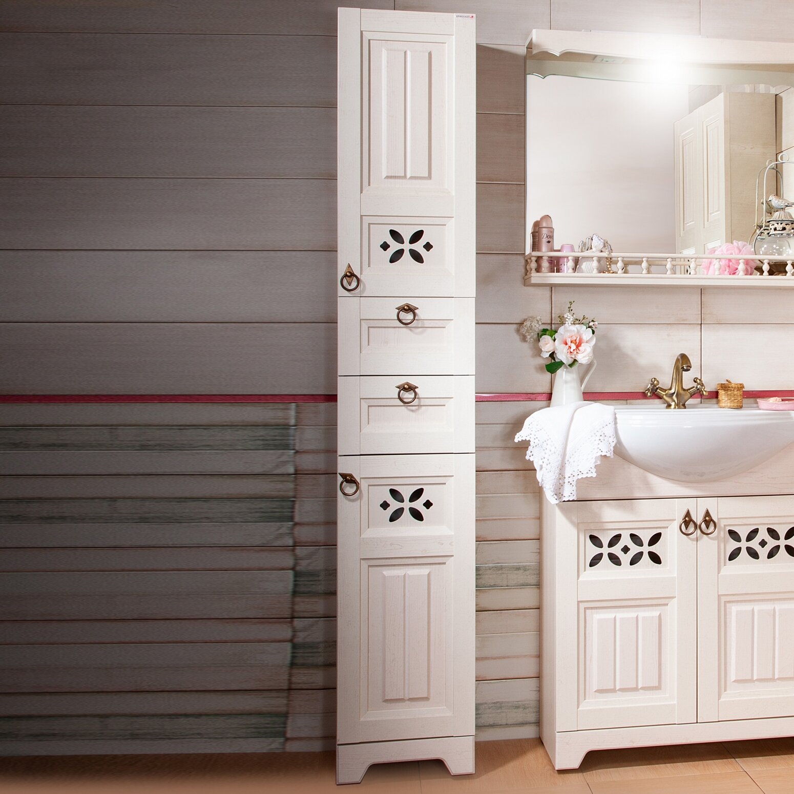 Чудесный комплект мебели в ванную в стиле Прованс или Кантри. Пастельный бежевый дуб, декоративные прорези на фасадах, ручки цвета состаренной бронзы - переносят нас в романтичную атмосферу французской деревни.Ширина модели составляет 34.7 см. Монтаж – напольный: шкаф устанавливается на ножки. Функциональность: Две секции с распашными дверцами и разделительными полочками Два выдвижных ящика Съемная корзина для бельяФурнитура: Четыре металлические ручки Четыре пластиковые опоры (декоративные спереди и поддерживающие сзади) Подвесы для крепления к стене Петли с доводчиками Направляющие металлические.