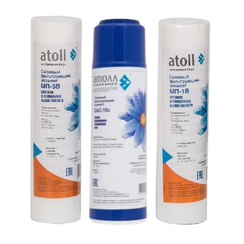 | ВКоробке | Механический картридж Atoll МП-5В - 1 шт. Угольный картридж Atoll GAC-10 Патриот - 1 шт. Картридж для повторной механической очистки Atoll МП-1В - 1 шт. |