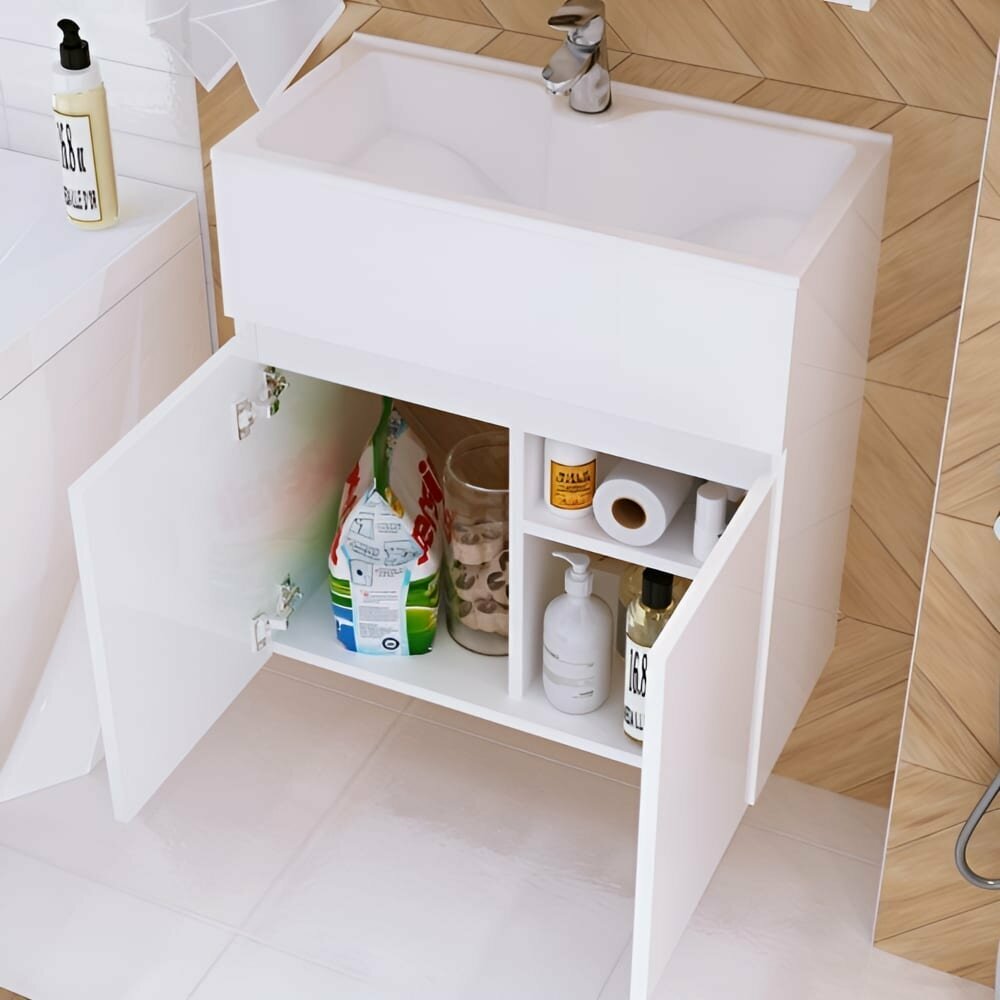 Тумба с раковиной Mira 60П 2 двери. Белый глянец. Цвет мебели: Белый. Крепления к стене идут в комплекте. Раковина, сифон, выпуск и гофрированная трубка идут в комплекте. Компактная мебель с уникальными габаритами - глубина тумбы всего 30 см. Мебель выполнена в современном минималистичном стиле, для которого характерны правильные геометрические формы, рациональность и эргономичность. Специально продуманная конструкция без ручек позволяет создать цельный легкий образ, не утяжеленный фурнитурой и дает возможность гармонично вписаться в любой интерьер. Для бережливой повседневной эксплуатации, тумбы оснащены демпферами и дверными петлями с доводчиками, обеспечивающими бесшумное и мягкое закрывание. В комплекте идет раковина из полимерной керамики и специализированный регулируемый телескопический сифон.