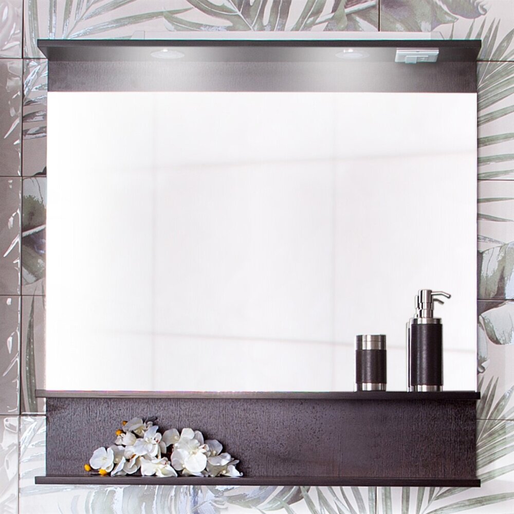 Зеркало Чили/Куба 90 с двумя полочками, подсветкой и розеткой выполнено в современном стиле, сочетает в себе элегантность и практичность. Зеркало устойчиво к воздействию повышенного уровня влажности и отлично впишется в интерьер любой ванной комнаты.Технические характеристики: - Цвет: венге.- Форма: прямоугольная.- Монтаж: подвесной.- Размеры (ШxВxГ): 90x89.8x15.6 см.- Система хранения: 2 открытые полки.- Подсветка, розетка с выключателем.- 2 галогенных светильника со сменными лампами 12В.В комплекте поставки:- зеркало;- комплект креплений.