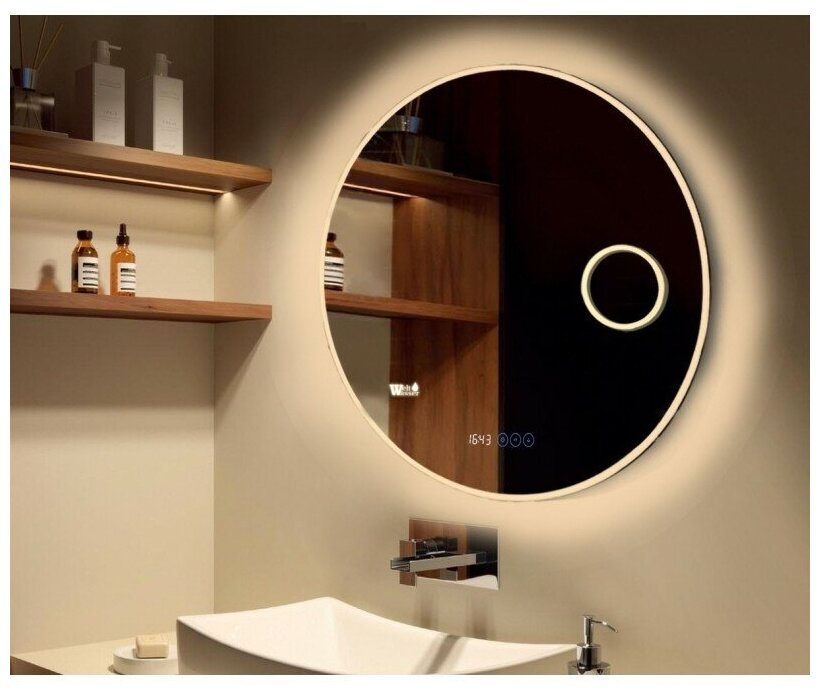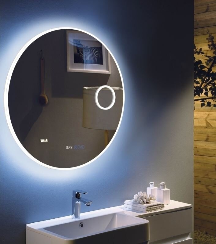 Подвесное зеркало WeltWasser Aurel 600-3 60 с увеличительным косметическим зеркалом, с часами, с системой предотвращения появления запотевания, с LED подсветкой и с сенсорным touch выключателем. Сертификат CE.