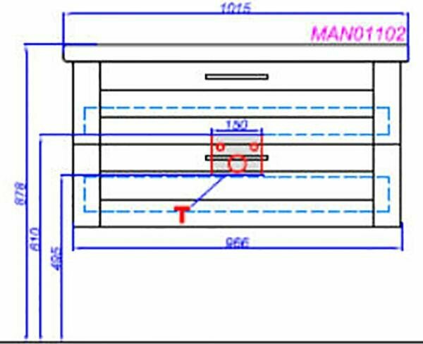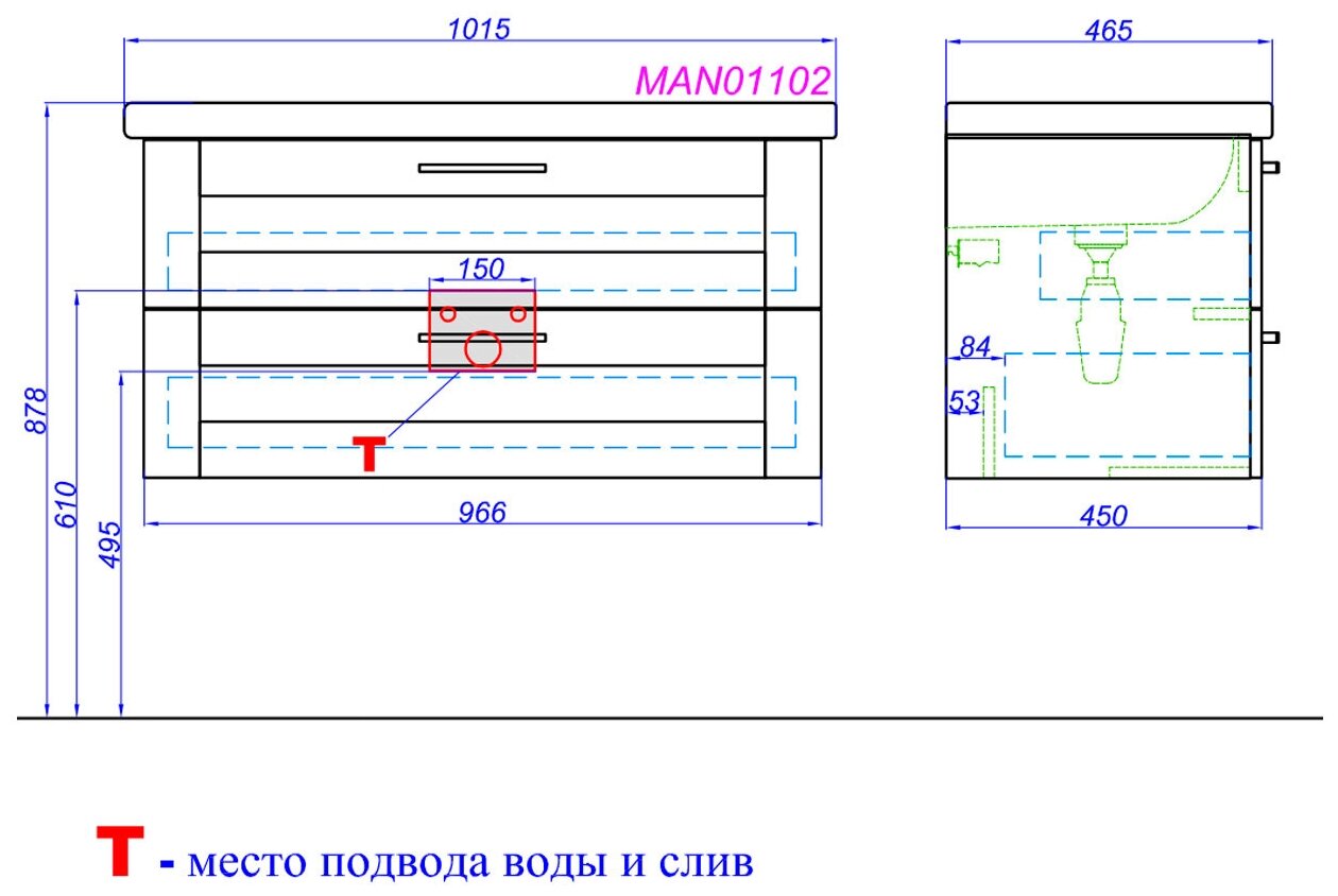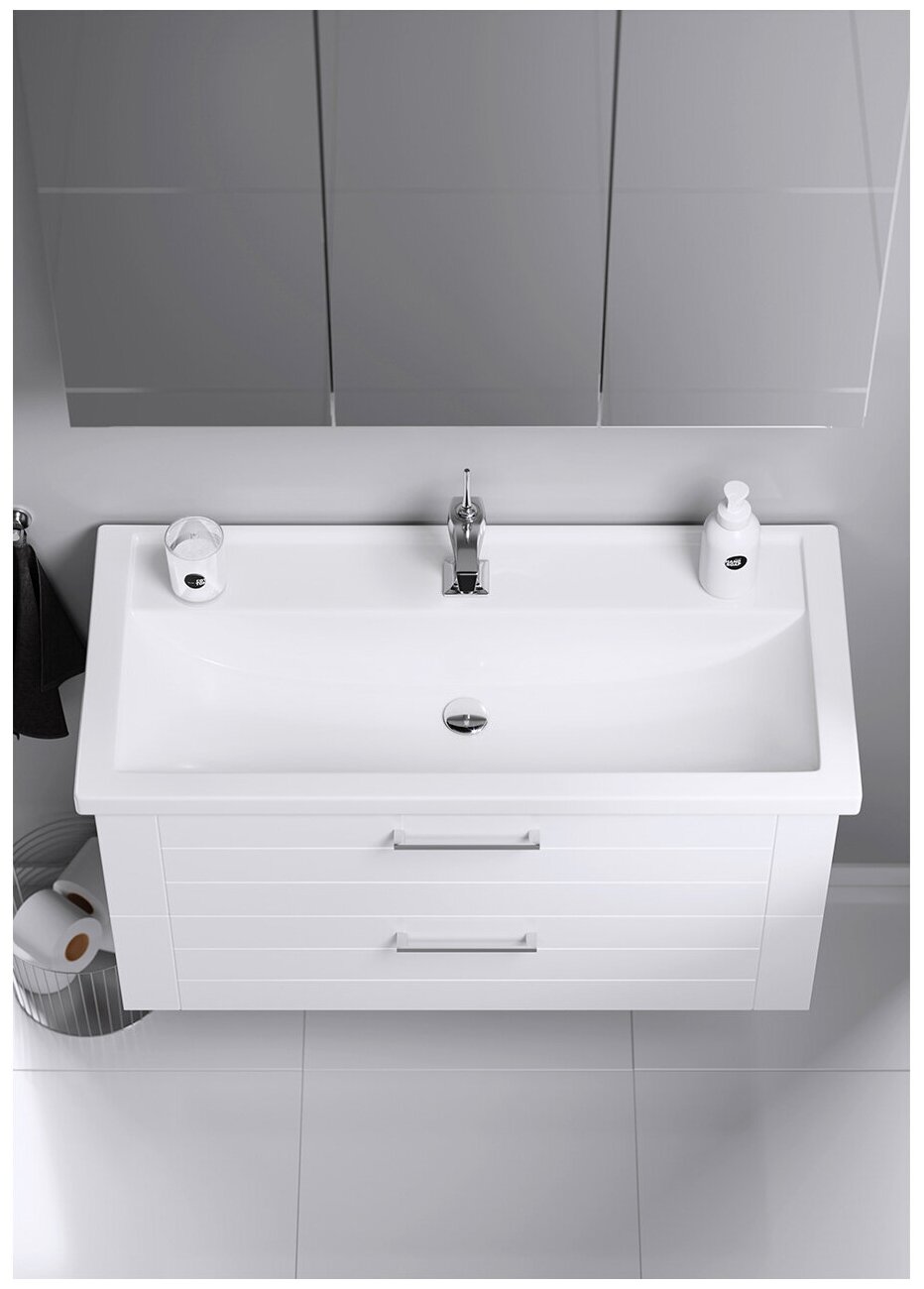 Тумба под раковину подвесная с 2 выдвижными ящиками. В верхнем ящике установлен органайзер. Скрытые направляющие Blum с системой мягкого закрывания. Цвет белый. Ширина 101.5 см.
