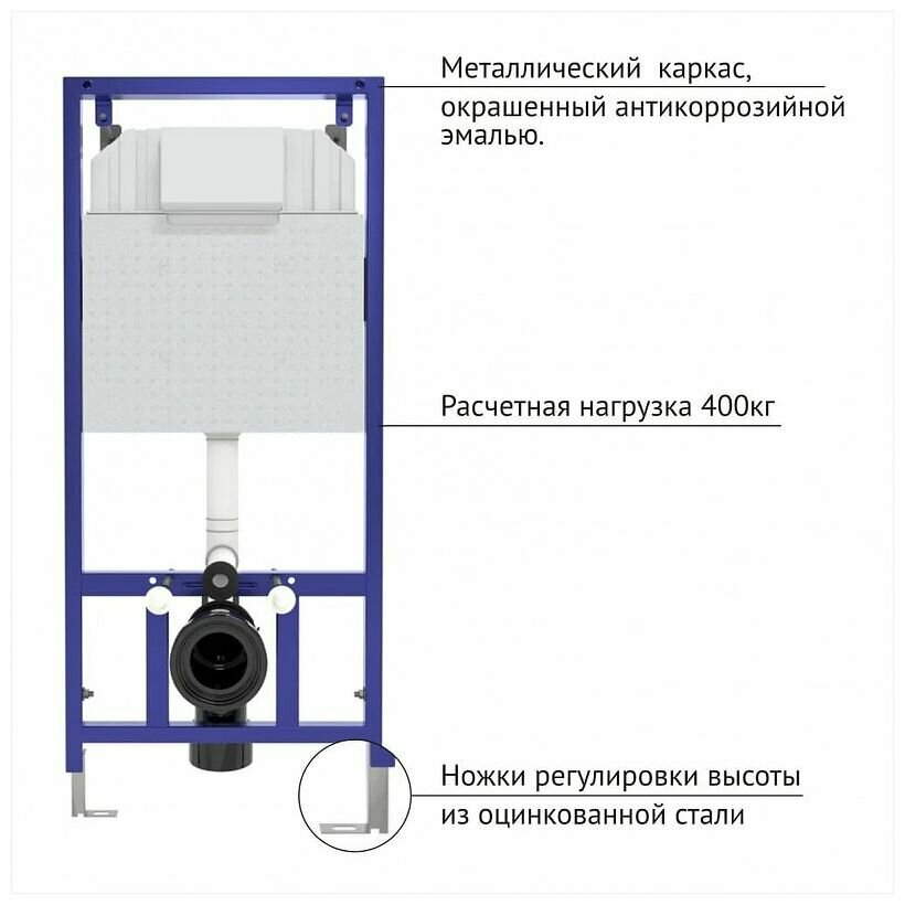 Толщина бачка 80мм для установки в малогабаритных помещениях. Межосевое расстояние под шпильки для подвеса унитаза 18 и 23 см. Комплект для термостойкой шумоизоляции, при давлении 3-5 бар уровень шума от 13 до 18 дБ. Объём резервуара воды 8,5л с функцией настройки слива от 3 до 7 л/мин. Металлический каркас, окрашенный антикоррозийной эмалью, расчетная нагрузка 400кг. Возможность установки в угол.