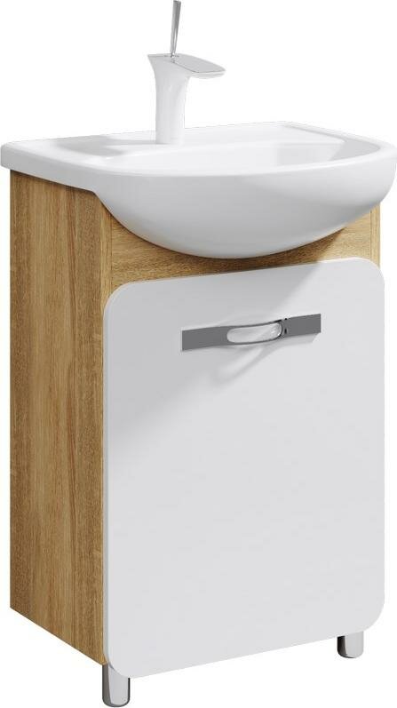 Напольная тумба под умывальник с универсальной левой/правой распашной дверцей. Мебельные петли с интегрированным доводчиком. Цвет дуб сонома/белый. Ширина 55.5 см.