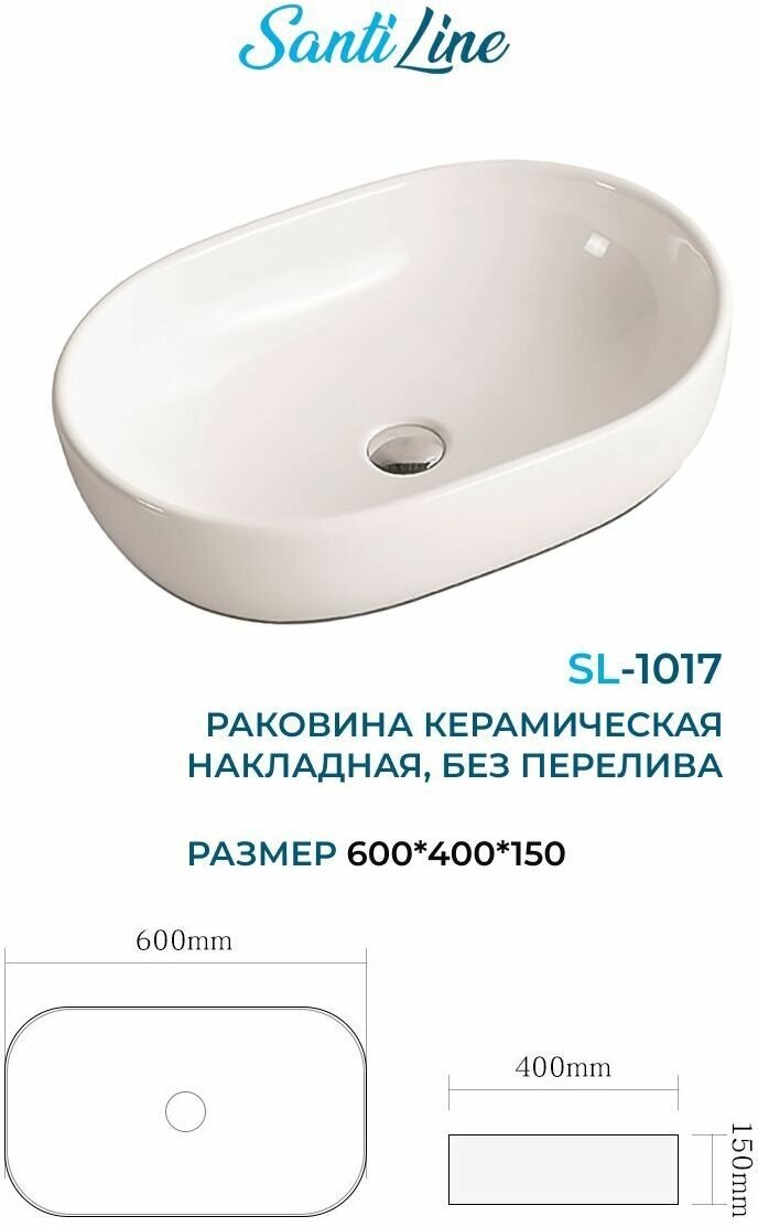 Раковина SantiLine SL-1017 выполнена в универсальном дизайне и дополнит современные интерьеры ванных комнат в различных цветовых гаммах.