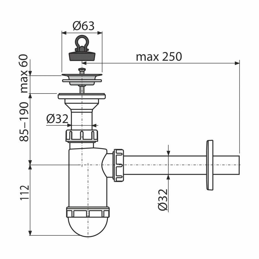 Сифон для умывальника DN32 с нержавеющей peшeткой DN63. Подключение к стоковой трубе ?32 мм.