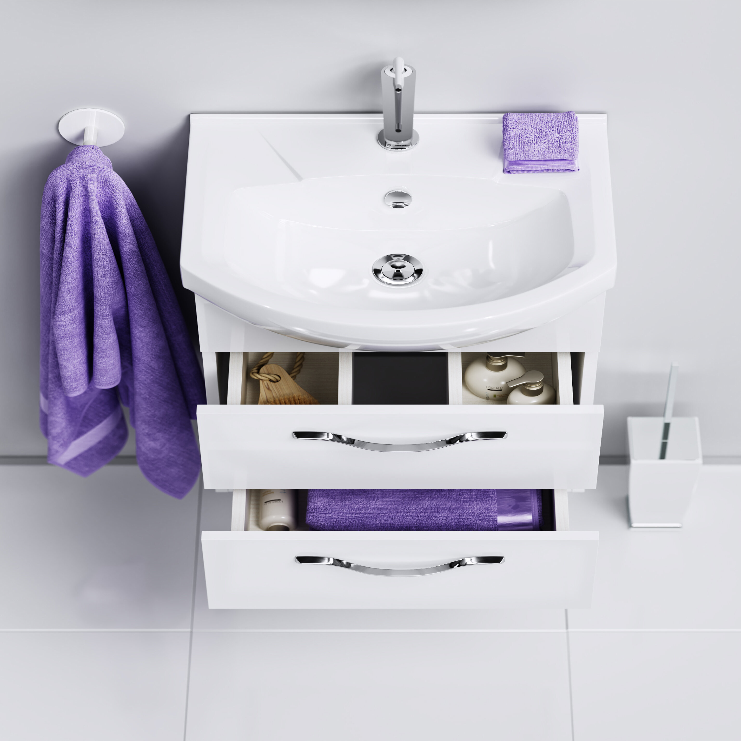 Тумба под раковину подвесная с 2 выдвижными ящиками. Направляющие Blum с системой мягкого закрывания. Цвет белый (глянцевая эмаль). Ширина 66 см.