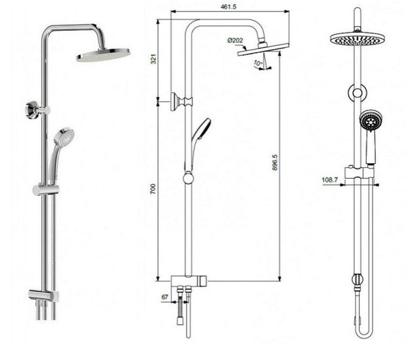 Душевой комплект включает лейку, стойку, шланг и верхний душ. Ручная лейка обладает несколькими режимами подачи воды, позволит сделать прием водных процедур максимально комфортным. Верхний душ - 1 режим (тропический дождь). Форсунки леек устойчивы к загрязнению известковым налетом и даже при слабом напоре не сбивают поток воды в одну струю. Держатель лейки с функцией регулировки по высоте. На штангу можно прикрепить дополнительные аксессуары (полочки, крючки и стаканы для зубных щеток, бритвы и прочее). Внешнее хромовое покрытие не только придаёт эстетически выгодные свойства, но и обеспечивает продолжительный срок службы.