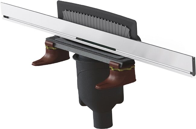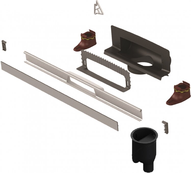 Решетка и рамка, нержавеющая сталь AISI 304. Комплект регулировки рамки и монтажные углы. Сетка для волос, нержавеющая сталь AISI 304. Комплект гидроизоляции. Желоб водосток пристенный. PP. Регулируемые по высоте ножки, пластик. Самопромывной S-образный сифон с переходником PP. Вертикальный выпуск, пропускная способность 48л/мин, монтаж 360°. Монтажный ключ, пластик