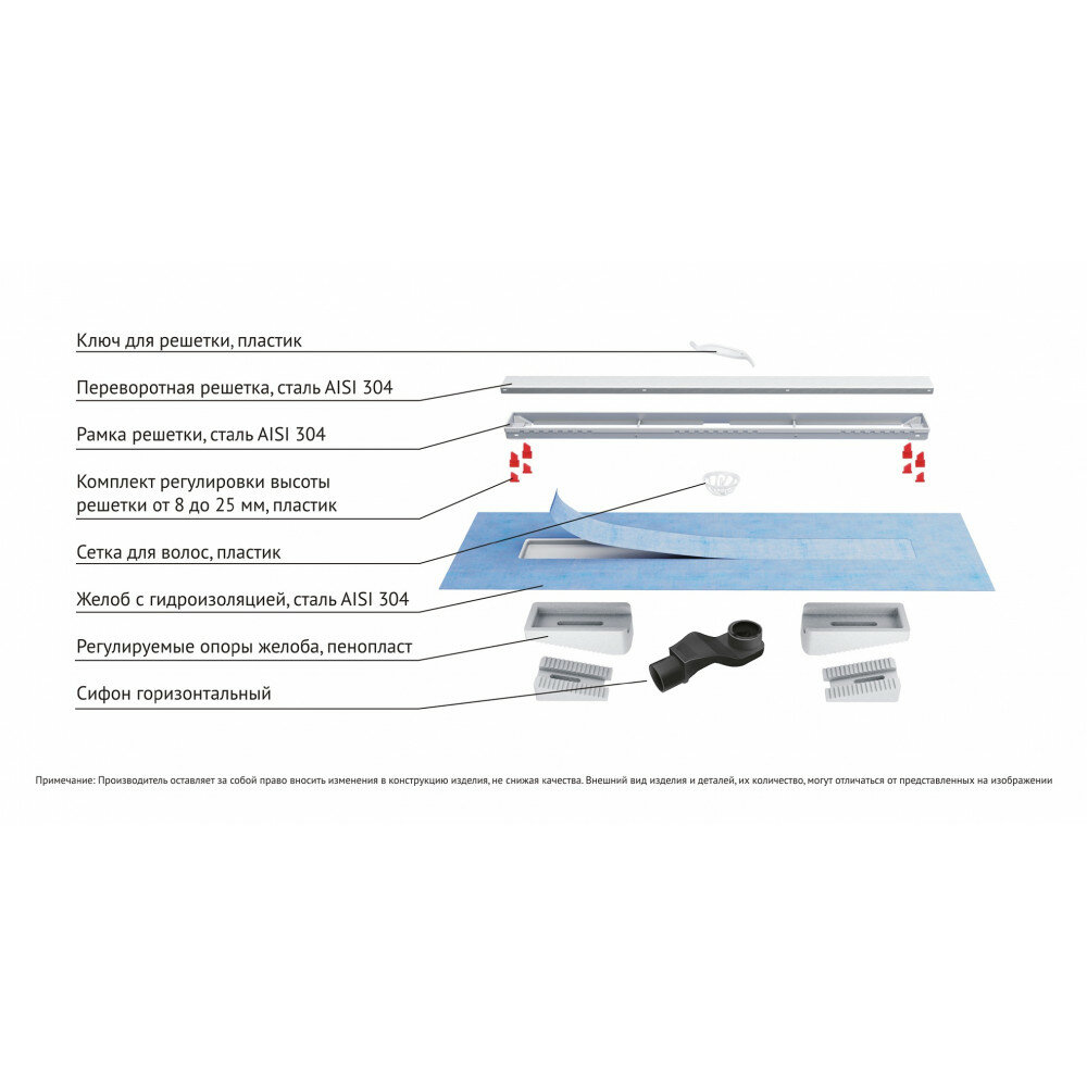 Решетка и рамка, нержавеющая сталь AISI 304. Двусторонняя установка решетки: металл и вклейка плитки с регулировкой по высоте от 8 до 25мм. Сетка для волос, пластик. Комплект гидроизоляции. Желоб водосток, нержавеющая сталь AISI 304. Монтажная заглушка и регулируемые по высоте ножки, пенопласт. Самопромывной S-образный сифон PP. Горизонтальный выпуск D50 H60, пропускная способность 42л/мин, монтаж 360°. Монтажный ключ, пластик
