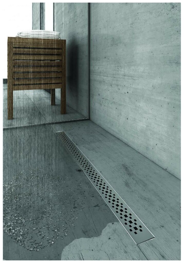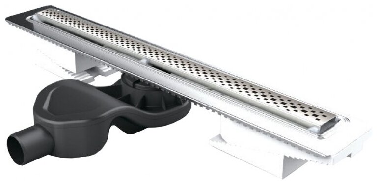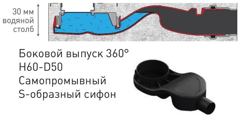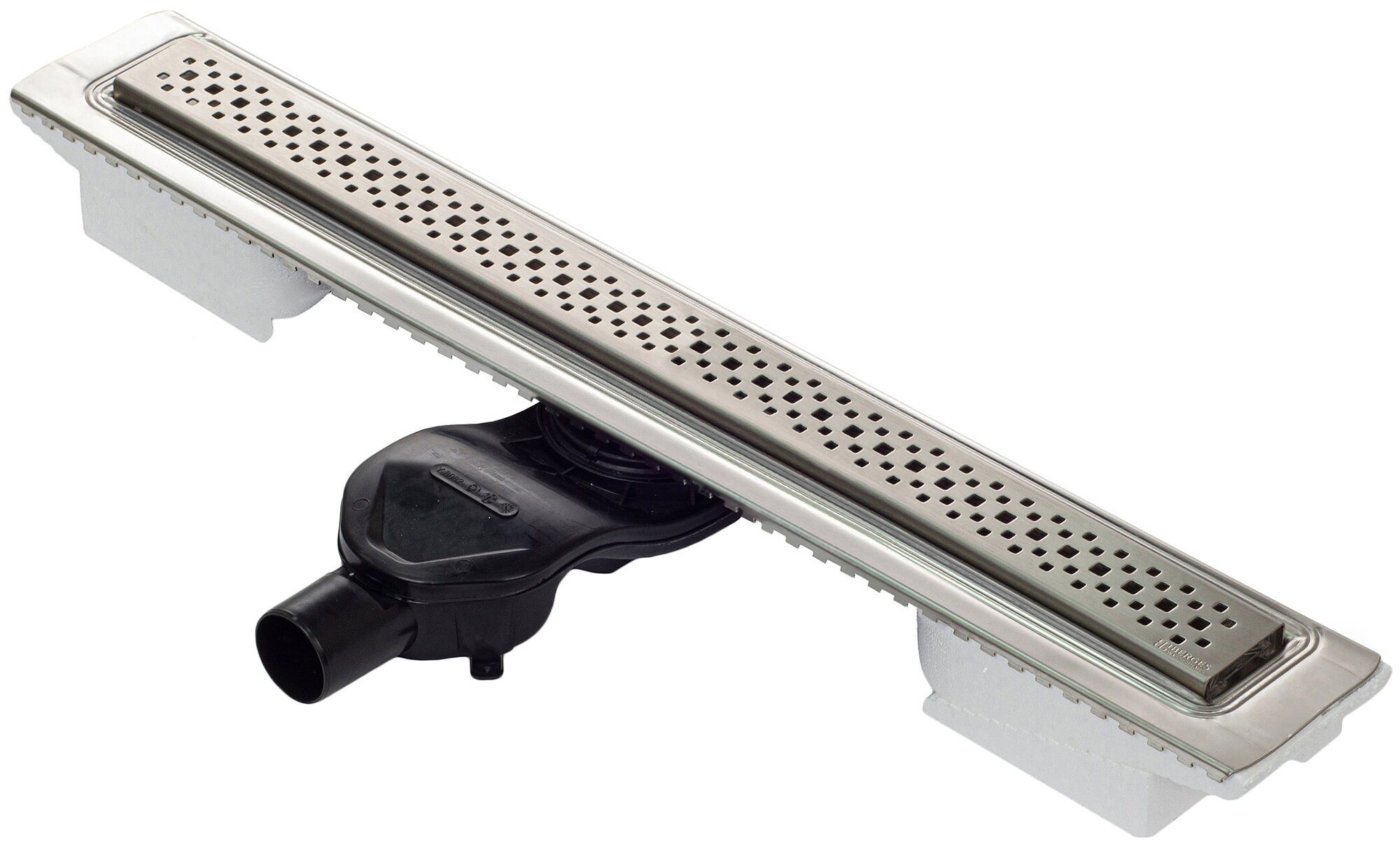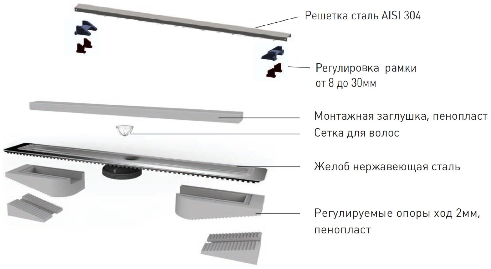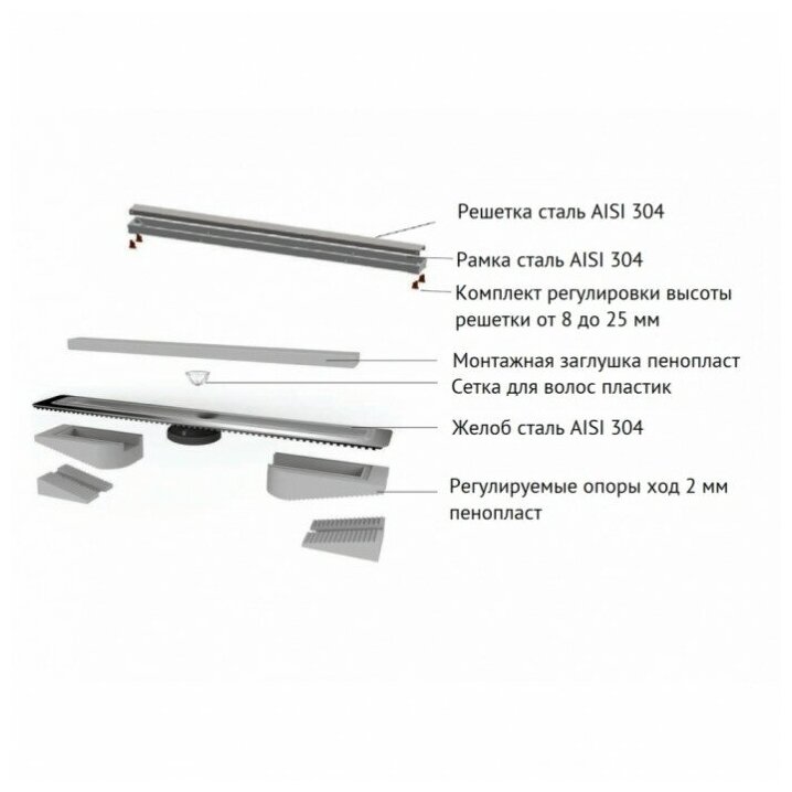 Решетка и желоб водосток, нержавеющая сталь AISI 304. Регулировка решетки по высоте от 8 до 25 мм. Сетка для волос, пластик. Комплект гидроизоляции. Монтажная заглушка и регулируемые по высоте ножки, пенопласт. Самопромывной S-образный сифон PP: горизонтальный выпуск D50 H60, пропускная способность 42л/мин, монтаж 360°. Монтажный ключ, пластик