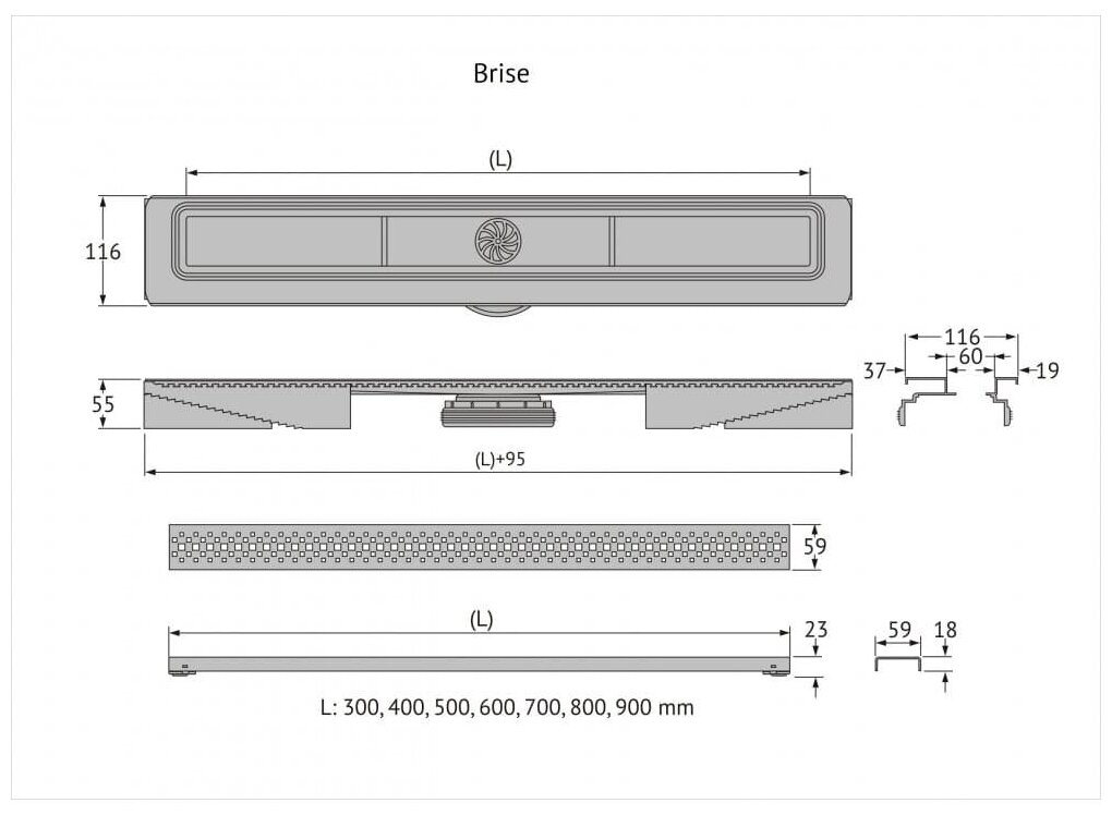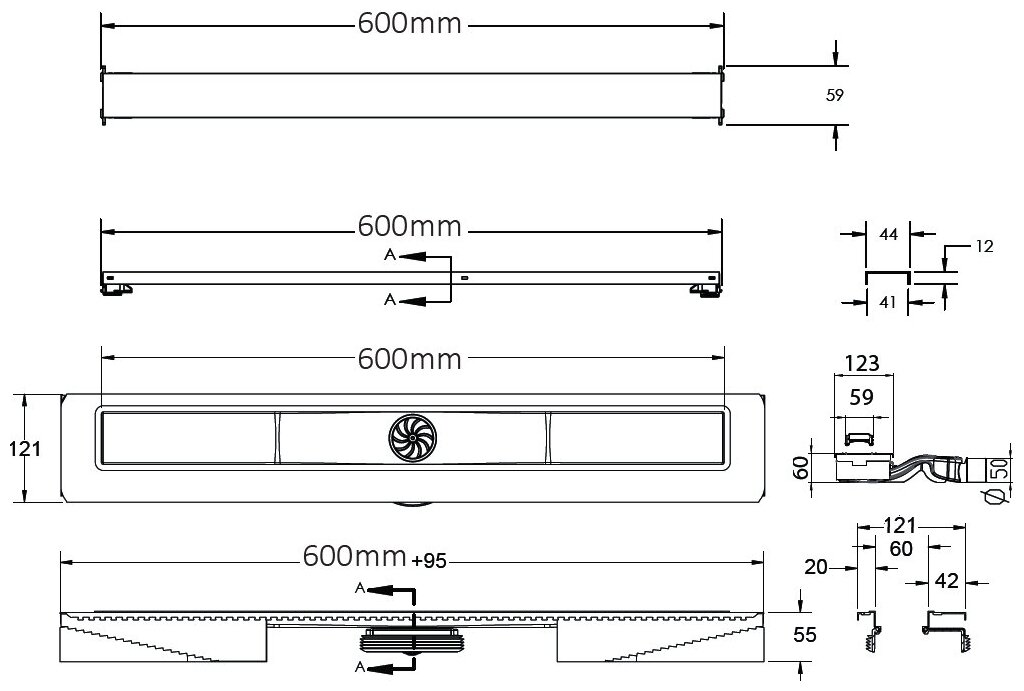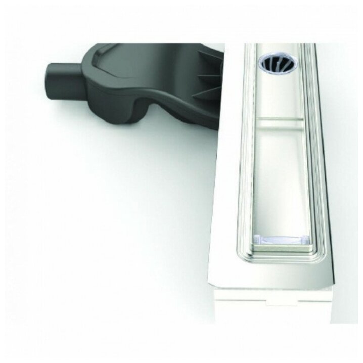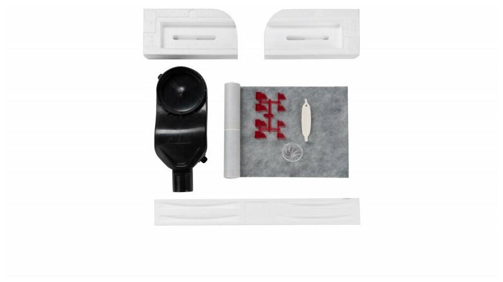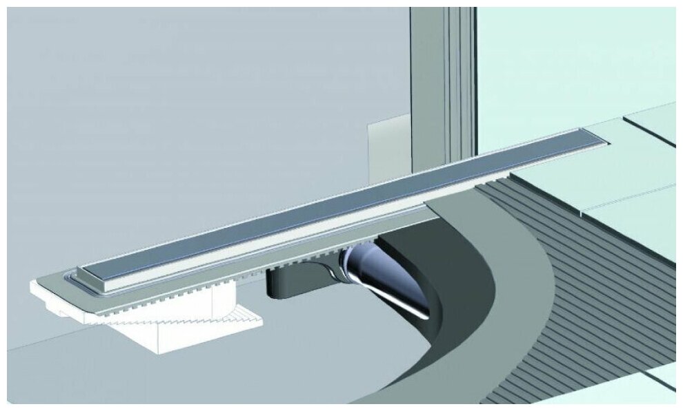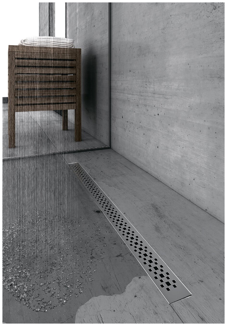 Решетка и желоб водосток, нержавеющая сталь AISI 304. Регулировка решетки по высоте от 8 до 25 мм. Сетка для волос, пластик. Комплект гидроизоляции. Монтажная заглушка и регулируемые по высоте ножки, пенопласт. Самопромывной S-образный сифон PP: горизонтальный выпуск D50 H60, пропускная способность 42л/мин, монтаж 360°. Монтажный ключ, пластик