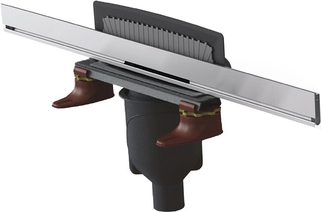 Решетка и рамка, нержавеющая сталь AISI 304. Комплект регулировки рамки и монтажные углы. Сетка для волос, нержавеющая сталь AISI 304. Комплект гидроизоляции. Желоб водосток пристенный. PP. Регулируемые по высоте ножки, пластик. Самопромывной S-образный сифон с переходником PP. Вертикальный выпуск, пропускная способность 48л/мин, монтаж 360°. Монтажный ключ, пластик
