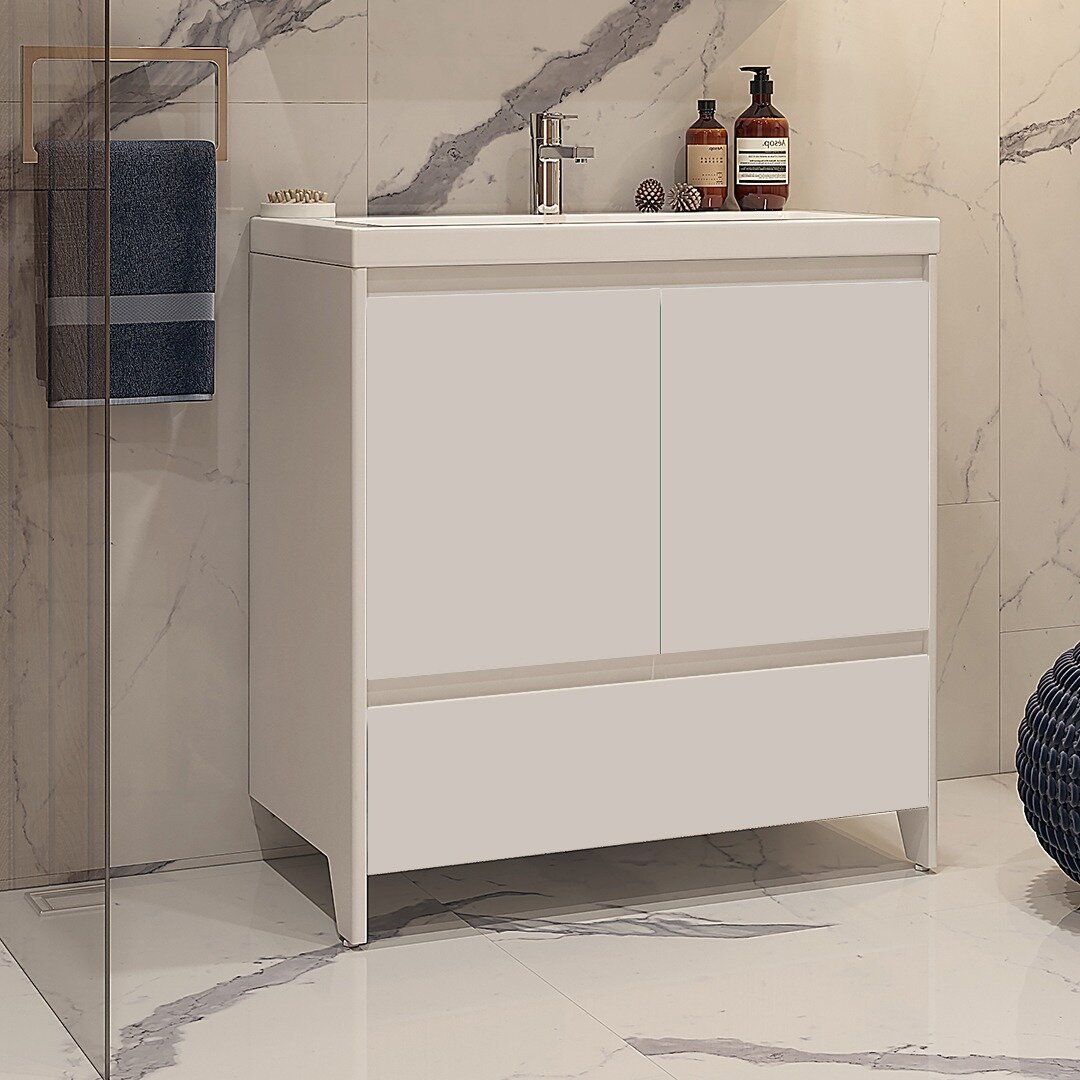 Тумба под раковину Velvex Klaufs 80.2D.1Y. Напольная. Боковые полки за распашными дверцами, выдвижной органайзер, нижний выдвижной ящик.