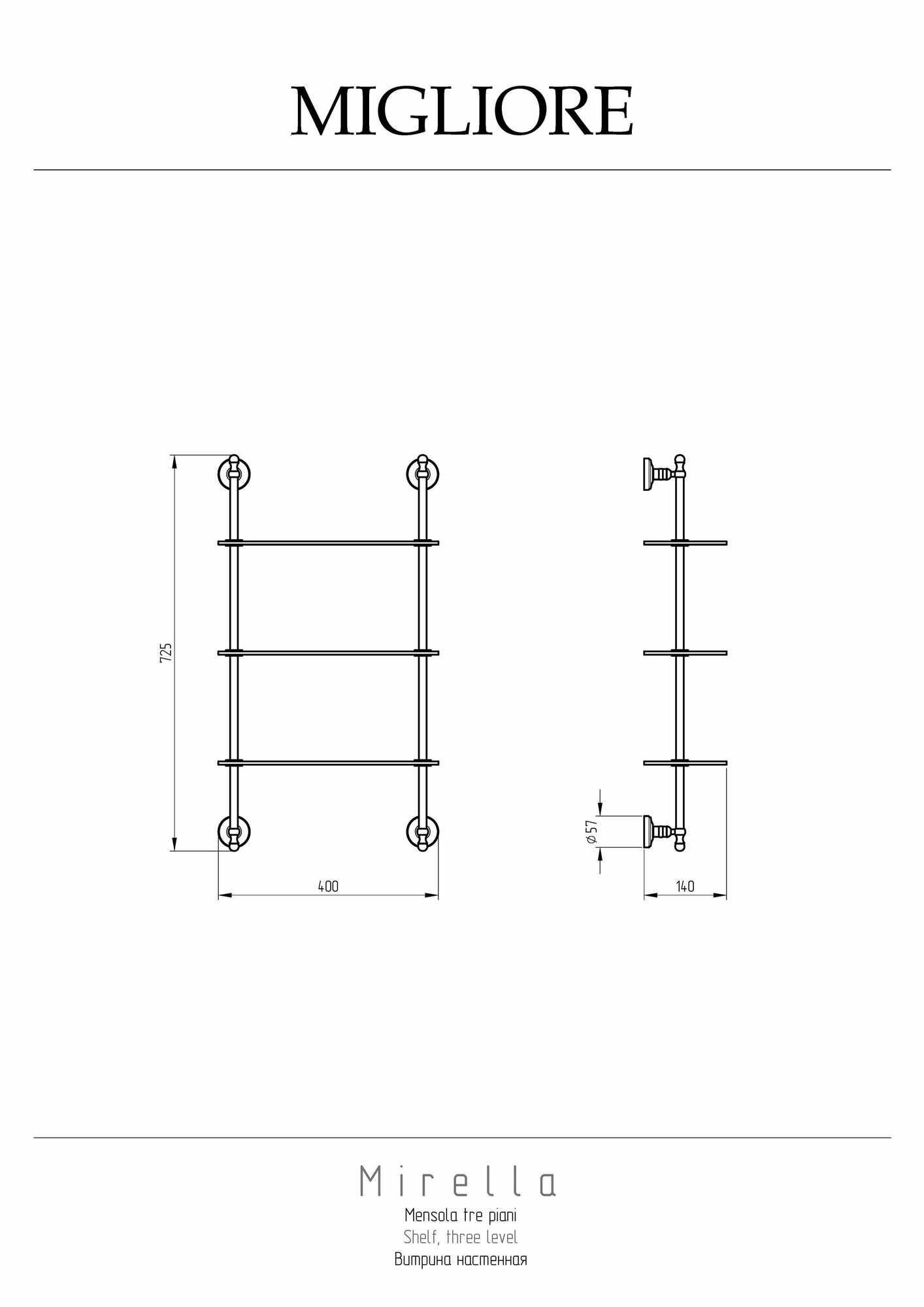Производитель Migliore в своей продукции использует идеальное, сочетание материалов (стекло, латунь) высокого качества, с абсолютным отсутствием вредных для здоровья веществ. Хром, основной цвет исполнения Migliore Mirella, гармонирующий с большинством интерьерных решений. Ключевые габариты изделия: ширина 40 см, глубина 15 см, высота 72 см. Прямоугольная форма ML.MRL-M089.CR прослеживается во всех линиях и придает аксессуару неповторимый стиль. Полка размещается в самом удобном положении на стене благодаря подвесному способу установки.