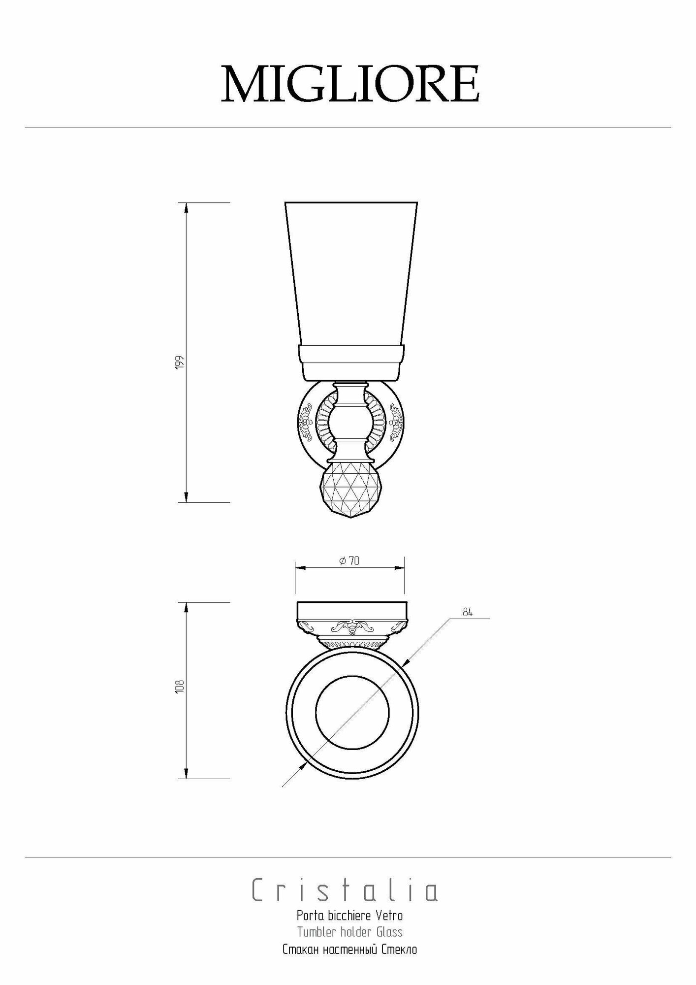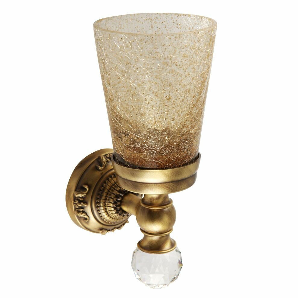 Стакан настенный коллекции CRISTALIA бренда MIGLIORE -один из самых необходимых аксессуаров для ванной комнаты. Стакан выполнен в классическом стиле и предназначен для хранения зубных щеток и тюбиков с пастой. Стекло стакана изготовлено вручную с добавлением фольги из золота, которая, растворяясь в стекле, образует богатый и красивый декор. Аксессуар украшен кристаллом Сваровски. При необходимости стакан можно вынуть из посадочного места, чтобы помыть Материал — латунь, покрытие цвета бронза. Внимание: бронзовое покрытие достаточно деликатное и для ухода рекомендуется протирать изделие мягкой безворсовой тряпочкой с мыльным раствором и вытирать насухо или использовать чистящее средство бренда MIGLIORE для смесителей и аксессуаров с деликатными покрытиями бронза, золото, медь. Материал: Латунь+стекло Оснащение: крепления (шурупы)