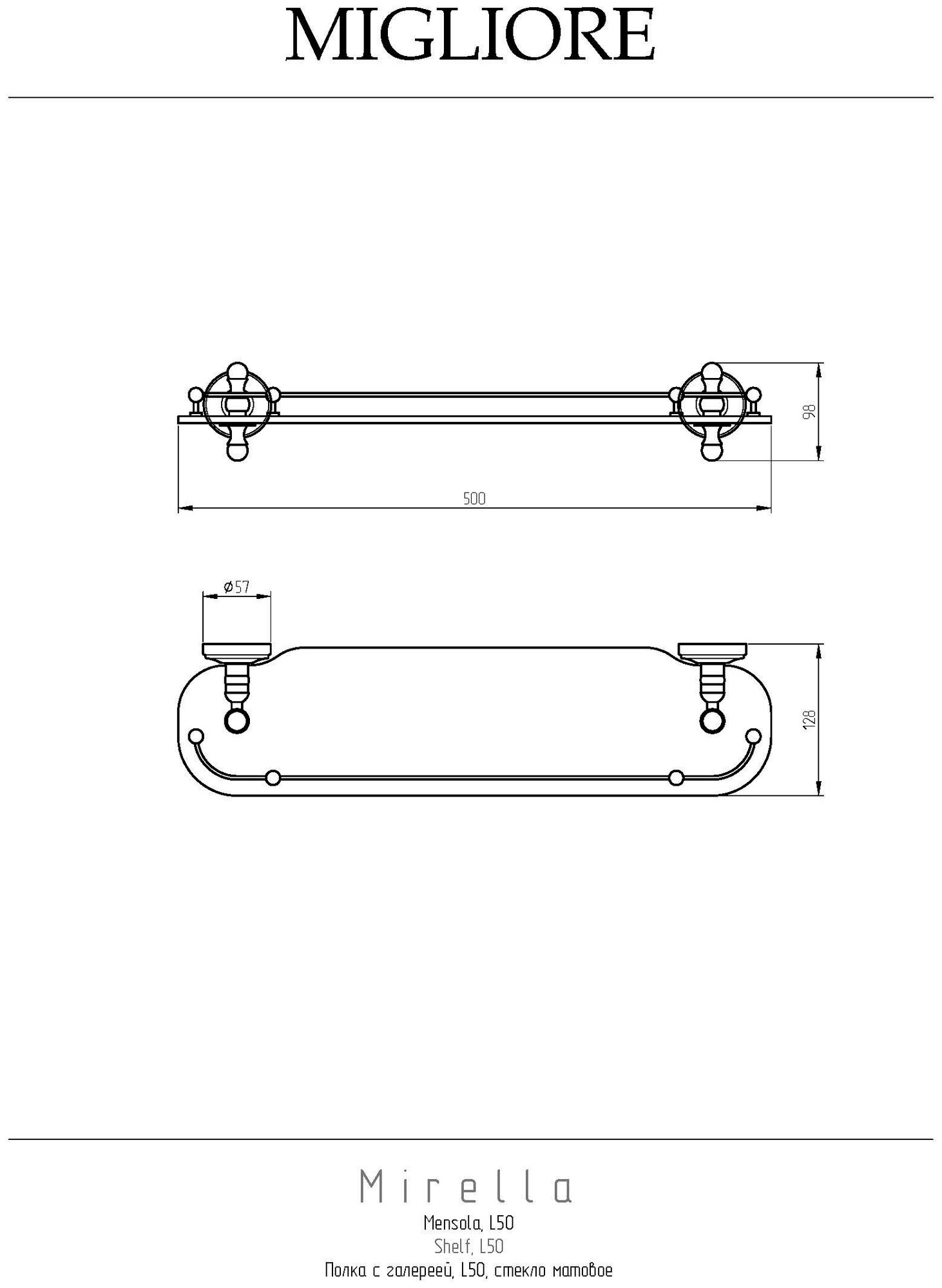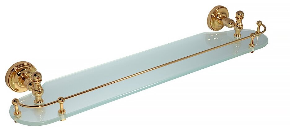 MIRELLA Полка c галереей L50 см, стекло матовое/золотоПолка с галереей серии MIRELLA бренда MIGLIORE длиной 50 см — это функциональный аксессуар для ванной комнаты в классическом стиле. Полка вешается над раковиной. На ней вы сможете разместить все необходимые косметические средства, которые будут всегда у вас под рукой. Ограничитель по переднему краю полки не позволит упасть тюбикам и предметам. Стекло легко чистится тряпочкой и/или средством для чистки стекол. Изделие выполнено из латуни и имеет высококачественное хромо-никелиевое покрытие, которое при правильном уходе надолго сохранит свой блеск. Рекомендуется использовать чистящее средство бренда MIGLIORE для смесителей и аксессуаров с хромированным покрытием.Внимание: золотое покрытие очень деликатное и для ухода рекомендуется использовать чистящее средство бренда MIGLIORE для смесителей и аксессуаров с деликатными покрытиями бронза, золото, медь и протирать мягкой ветошью.Материал: Латунь+стекло; Оснащение: крепления (шурупы)