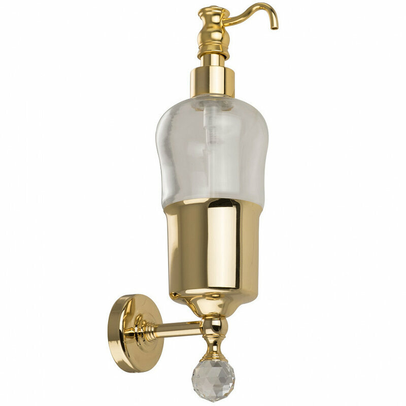 Дозатор для жидкого мыла Migliore Amerida 16596.Характеристики:- Цвет: золото.- Материал: латунь, стекло, кристалл Swarovski.- Размеры (ВxШxГ): 28.8x9.5x10.8 см.- Монтаж: на стену.Уход:- Изделия цвета Золото покрыты 24-х каратным золотом. Данное покрытие очень деликатно. Для ежедневного ухода рекомендуется протирать такие изделия только мягкой неабразивной тряпочкой, смоченной в мыльном растворе, затем чистой влажной тряпочкой и затем сухой тряпочкой. Рекомендуем использовать специализированное чистяющее средство для золотых и бронзовых покрытий.В комплекте поставки:- Дозатор для жидкого мыла.- Настенный держатель.