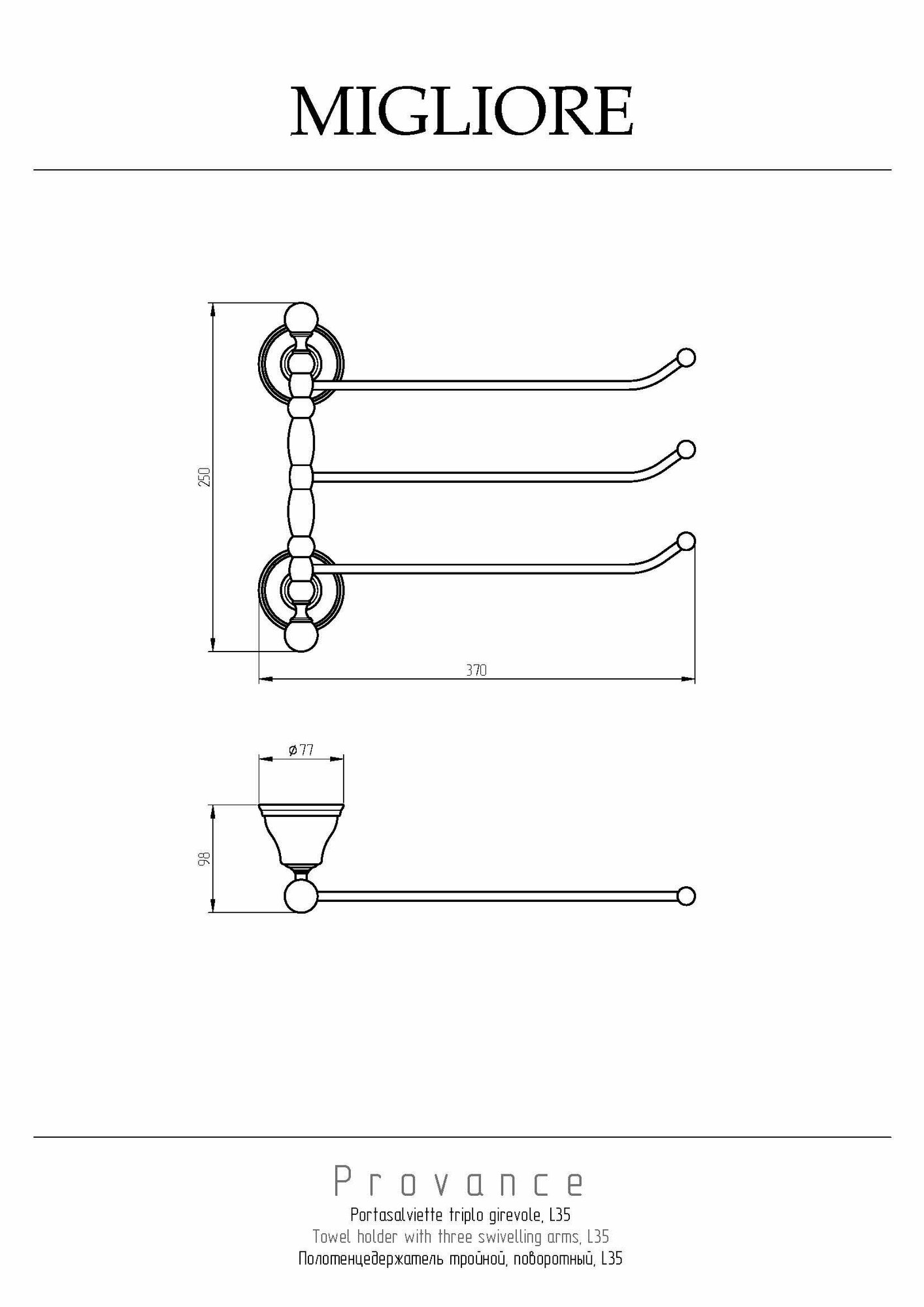 Аксессуары коллекции PROVANCE бренда MIGLIORE имеют нежный цветочный декор на керамике и создают уют в ванной комнате в классическом или рустикальном стиле. Полотенцедержатель тройной поворотный коллекции PROVANCE длиной 35 см очень удобен в использовании — для него достаточно небольшого пространства, и держатели можно развернуть в одну или другую сторону в зависимости от наличия места на стене.