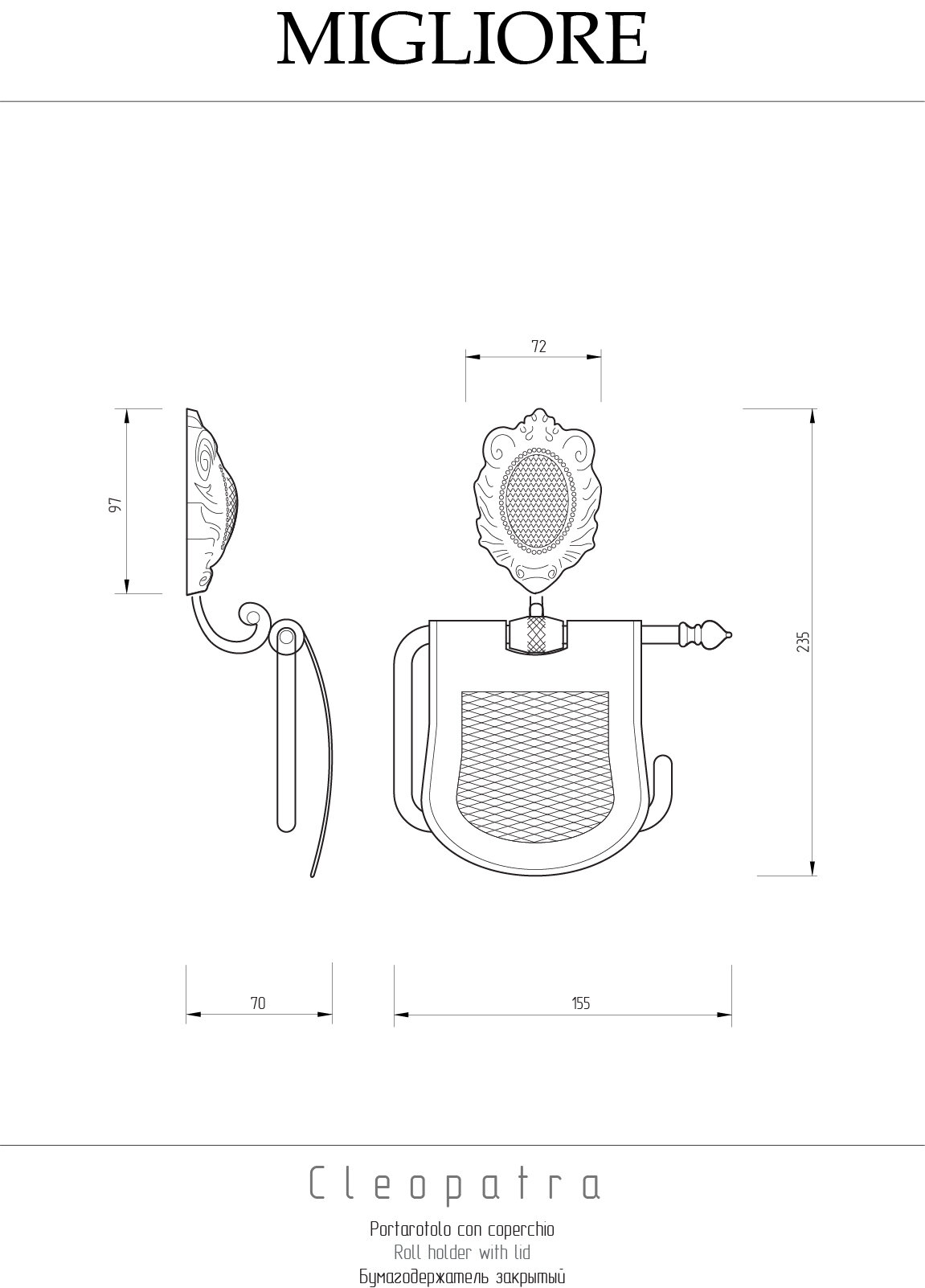 Бумагодержатель закрытый коллекции CLEOPATRA бренда MIGLIORE — это один из необходимых аксессуаров для ванной комнаты. Бумагодержатель с крышкой смотрится эстетично, и крышка защищает бумагу от попадания брызг и пыли. Розетка аксессуара имеет необычную форму, и удобный крепеж. Материал — латунь, покрытие цвета бронза. Внимание: бронзовое покрытие достаточно деликатное и для ухода рекомендуется протирать изделие мягкой безворсовой тряпочкой с мыльным раствором и вытирать насухо или использовать чистящее средство бренда MIGLIORE для смесителей и аксессуаров с деликатными покрытиями бронза, золото, медь.