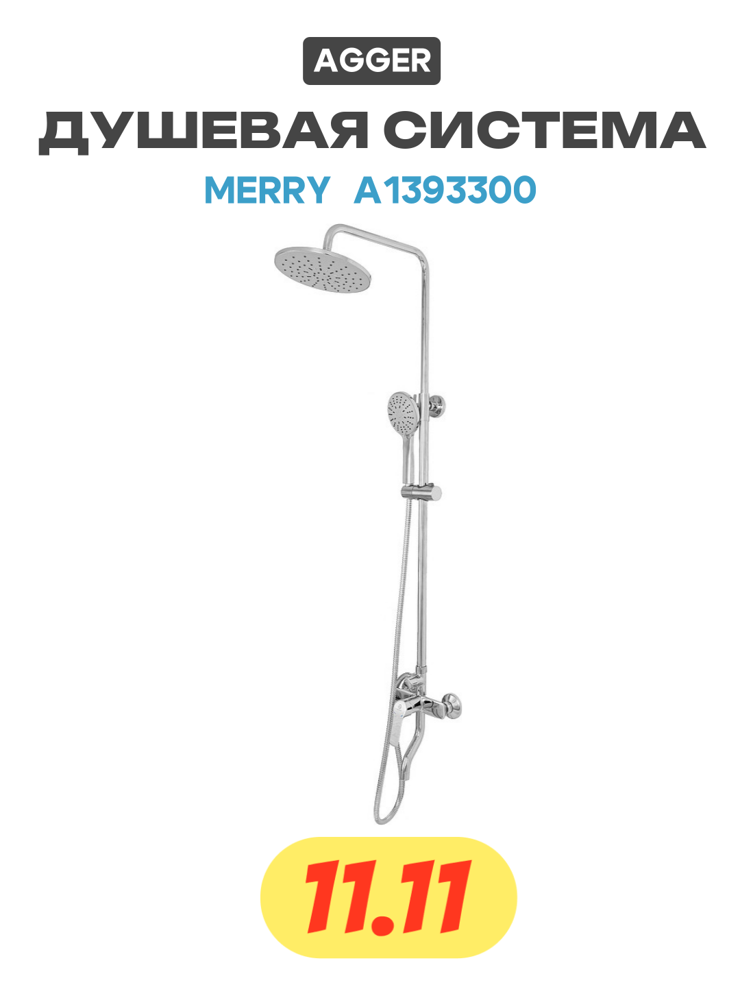Agger Merry A1393300 Душевая система со смесителем: поворотный излив, ручной душ 3 режима с регулируемым по высоте держателем, верхний душ 200 мм с регулировкой угла наклона и силиконовыми наконечниками, телескопическая штанга.