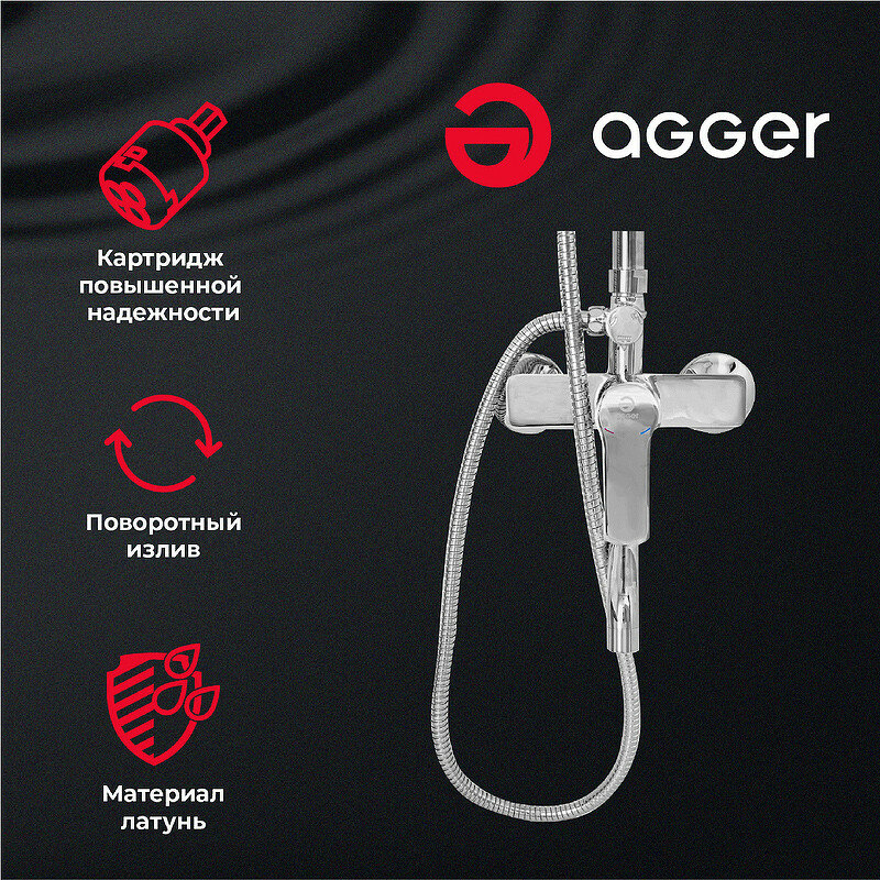 Agger Merry A1393300 - душевая система со смесителем оснащенным поворотным изливом. Демонстрирует традиционное немецкое качество в каждой детали. Основным устройством конструкции является смеситель, к которому подведена штанга с головным душем. Вода подается на него с помощью регулировки дивертором расположенным на смесителе.