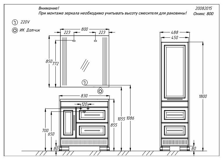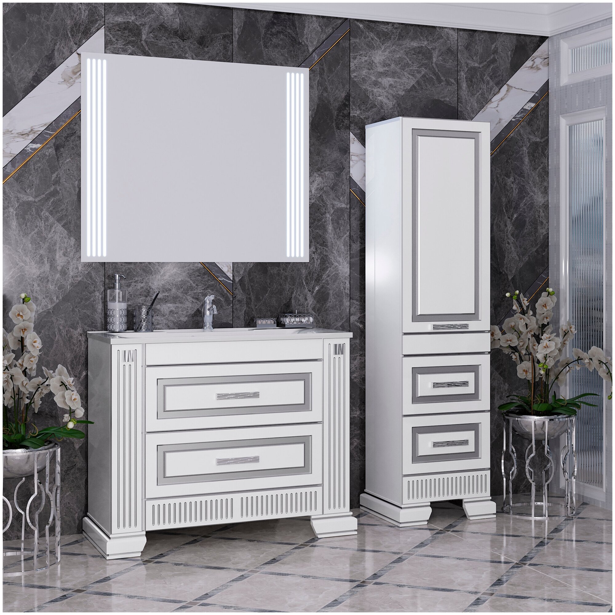Современная и шикарная мебель для ванной комнаты Оникс изготавливается из высококачественного МДФ с глянцевым покрытием и декорируется золотой и серебристой патиной. Комплект мебели для ванной комнаты Оникс на 80 см предлагается с двумя выдвижными ящиками и одной дверцей, комплект на 100 см предлагается с двумя выдвижными ящиками и двумя дверцами. Мебель для ванной комнаты из коллекции Оникс комплектуется раковиной из литого мрамора и оригинальным зеркалом со встроенной подсветкой и сенсорным выключателем.