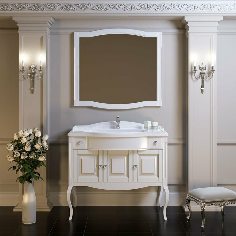 Коллекция Лаура создана нашими дизайнерами в стиле Нео Классика. Фасадные детали изготовлены из массива бука. На тумбу из коллекции Лаура можно установить мраморную столешницу с врезной накладной керамической раковиной (для размера 100 см) или раковину из литого мрамора. Особый шик коллекции добавляют золотые ручки, инкрустированные стразами. Мебель для ванной комнаты из коллекции Лаура представлена в двух размерах 100 см и 120см. Коллекцию Лаура дополняет изящный пенал с оригинальными гнутыми ножками.