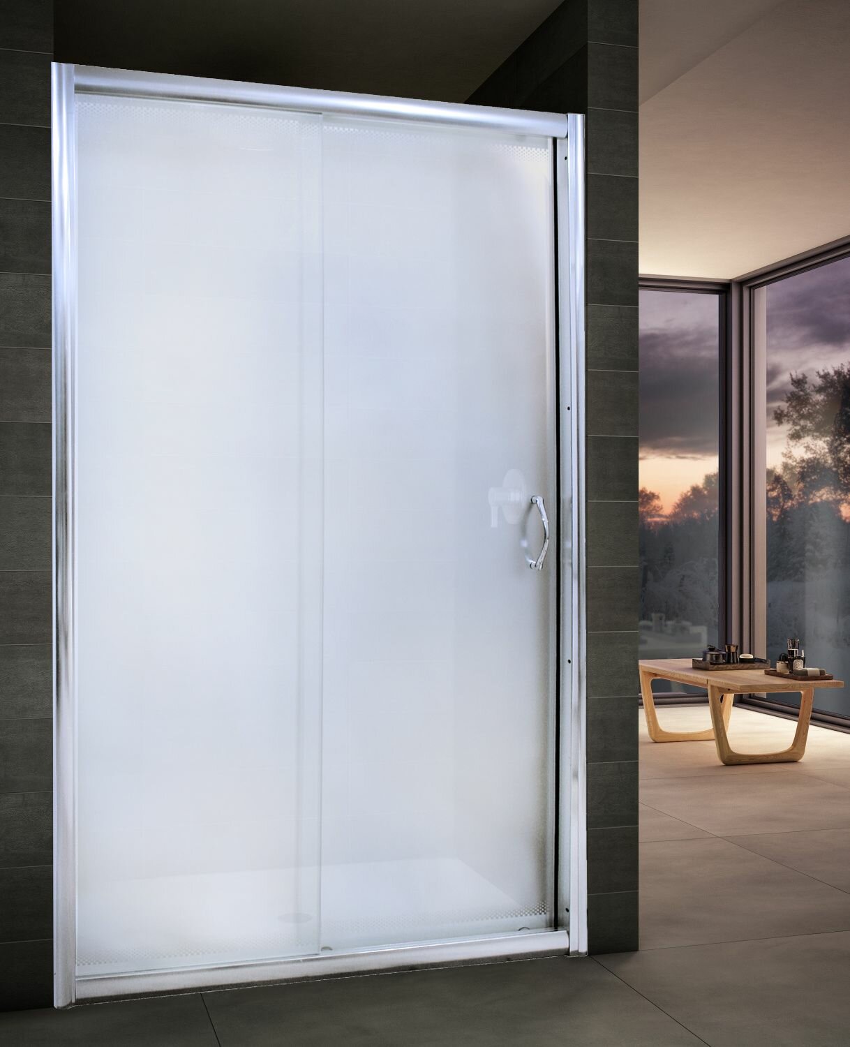 КОМПЛЕКТАЦИЯ: Дверь для душа 2-х секционная. Одна часть неподвижная, вторая раздвижная. Вход можно установить как слева, так и cправа. Боковые регулировочные профили позволяют регулировать ширины двери ± 2 см от размера и компенсируют небольшие отклонения стены от вертикали. Cтекло 5 мм. ПЕРЕДНЯЯ ЧАСТЬ - Матовое стекло, профиль хромированный.