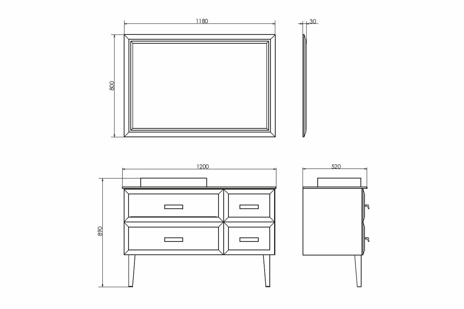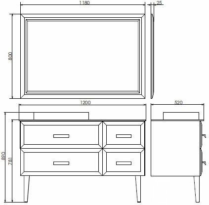 Зеркальное высококачественное полотно с амальгамой на основе серебра. Рама из МДФ окрашенного белой глянцевой эмалью. Фацет на зеркальном полотне и раме повторяется на выдвижных ящиках тумбы-умывальника.