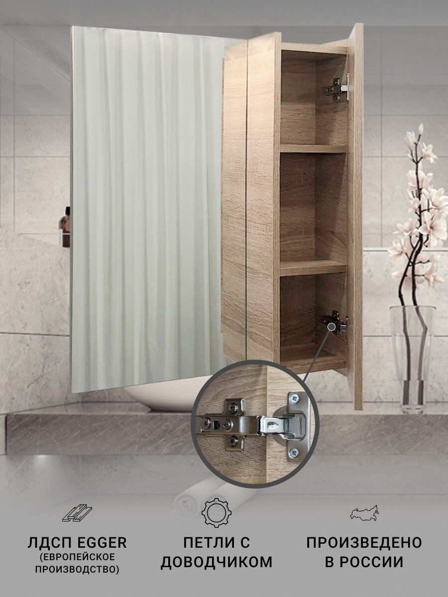Зеркальное высококачественное полотно с амальгамой на основе серебра. Створка мебельного элемента оснащена петлями с системой Push-to-open (открытие при нажатии). За дверцей одна горизонтальная полка.
