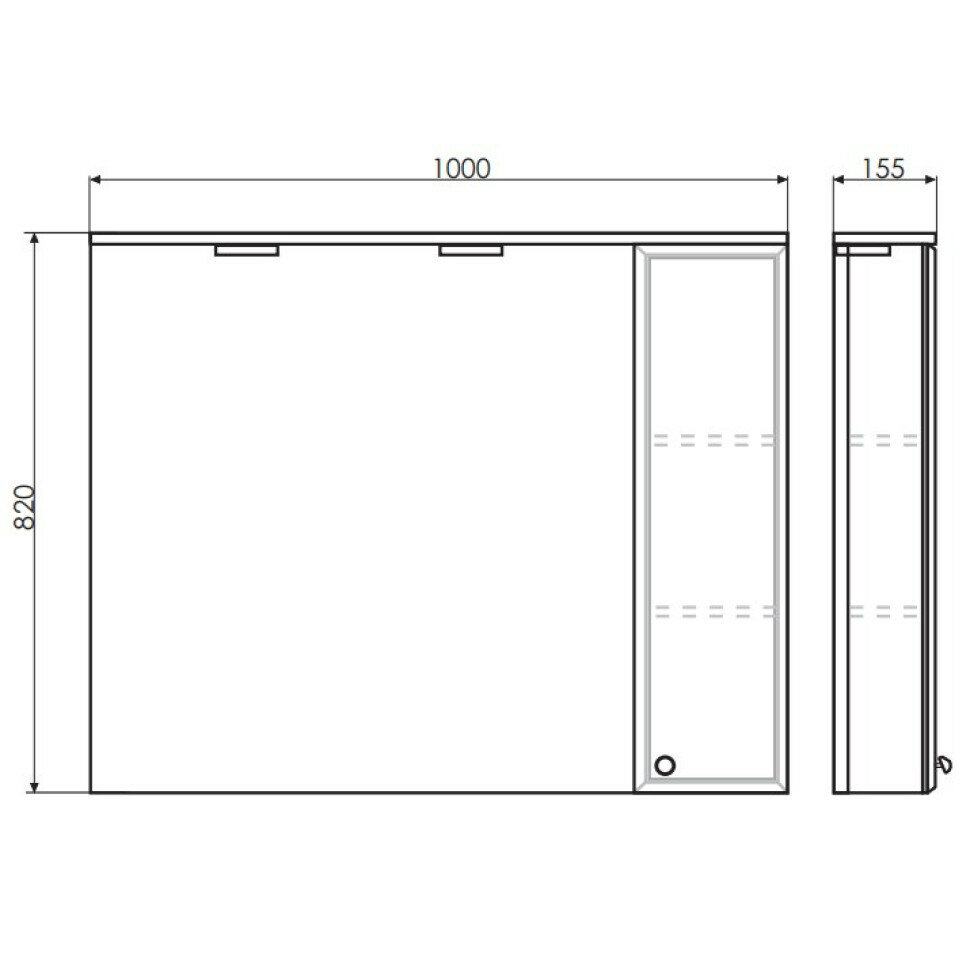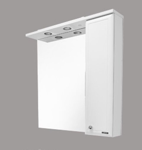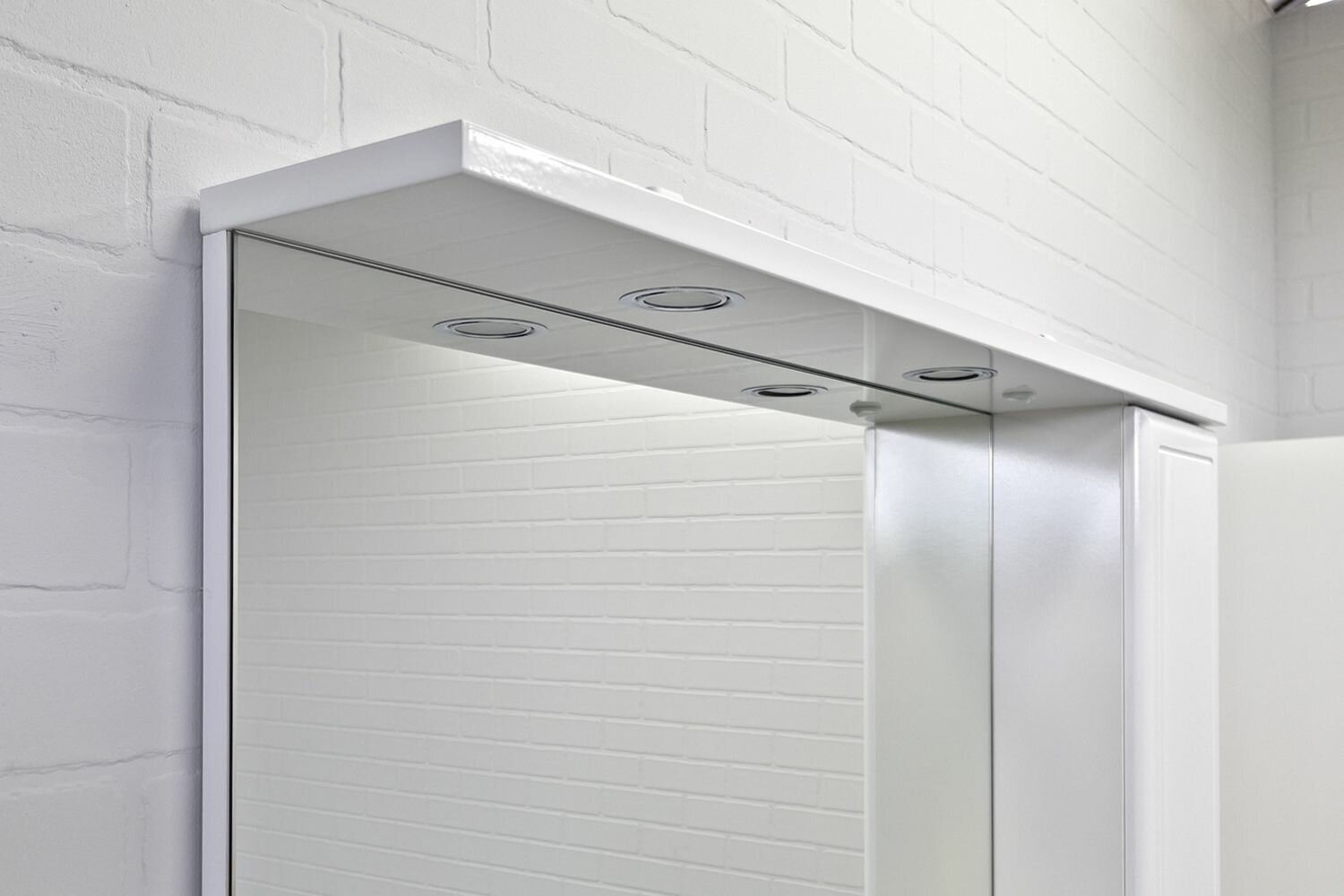 Зеркальное высококачественное полотно с амальгамой на основе серебра. Створка мебельного элемента оснащена петлями с системой плавного закрывания и покрыта белой глянцевой эмалью. В верхней полке два точечных светильника и выключатель.