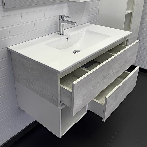 Подвесная тумба с двумя ящиками оборудованными системой плавного закрывания и пространством для открытого хранения.