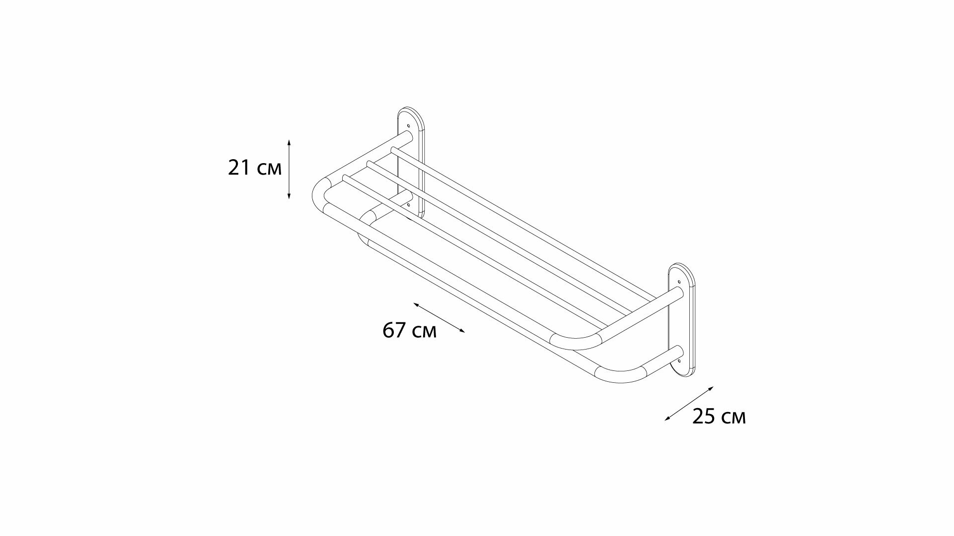 полка для полотенец, монтаж: настенный. Ширина: 66,5. Высота: 21,5 см. Глубина: 25 см. Метод крепления: шурупы. Тип рисунка: без рисунка. Фактура: гладкая. Форма: прямоугольная