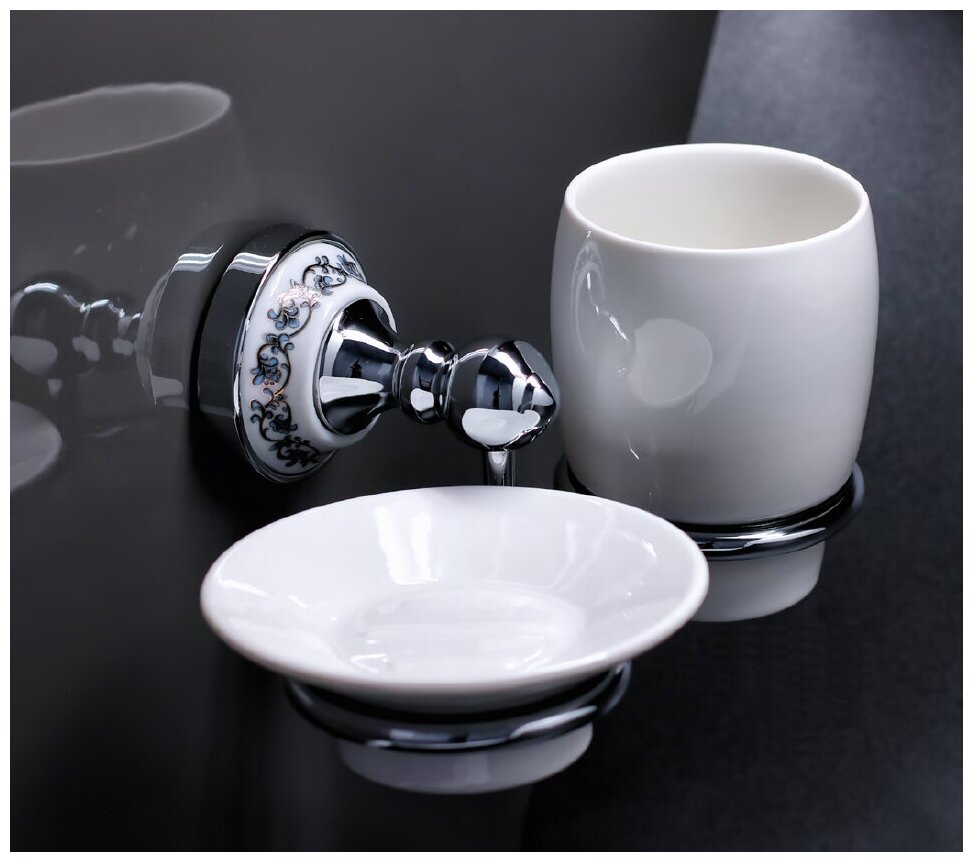 Изделие выполнено в элегантном дизайне, который будет органично смотреться в интерьере ванной в классическом стиле или ретро. Керамический декор настенных креплений белого цвета с черным изящным орнаментальным узором. Размеры: 21,5x10,1x14,2 см.