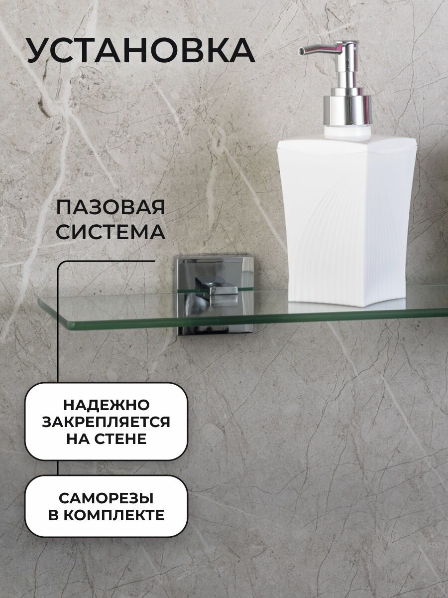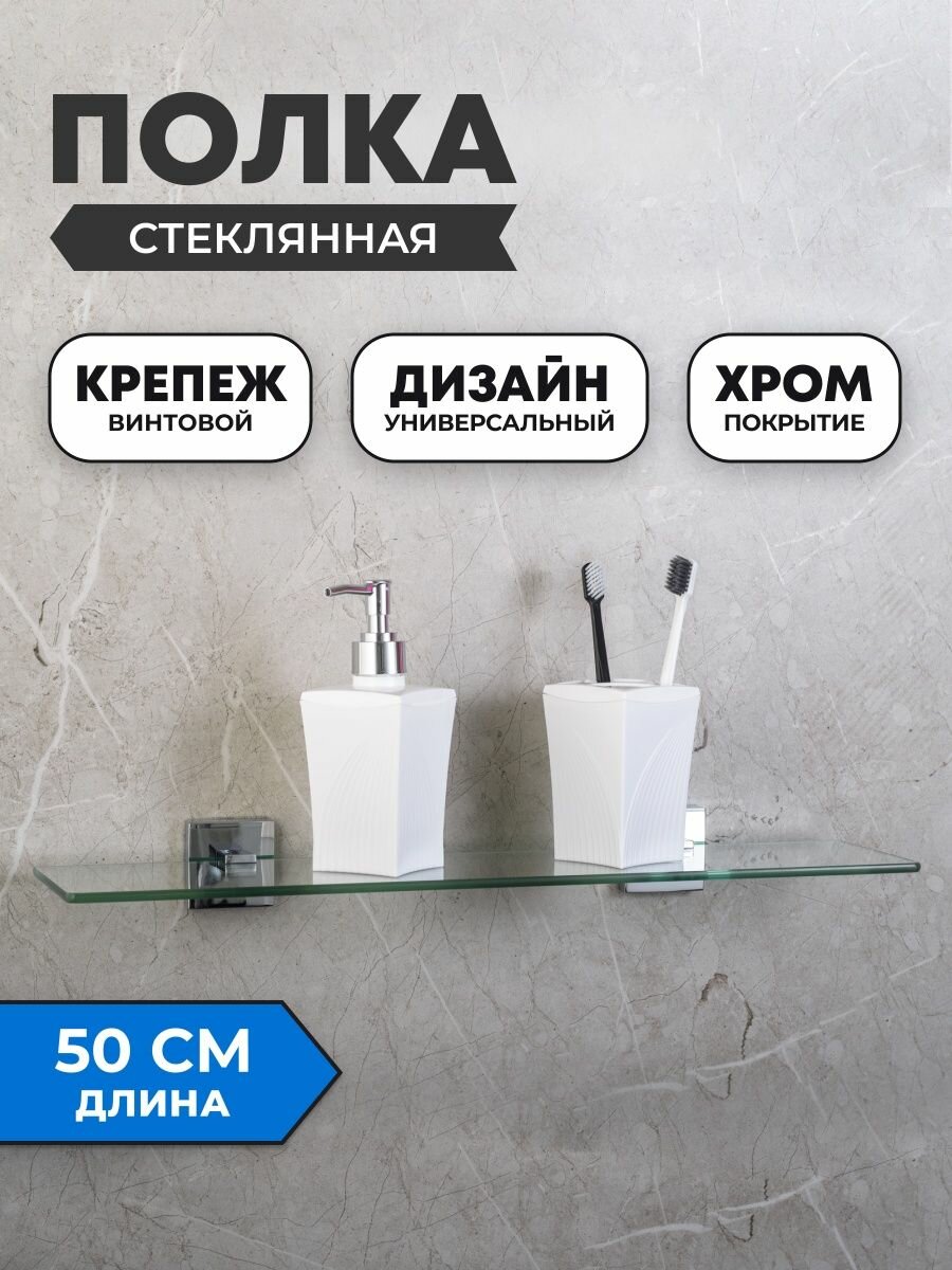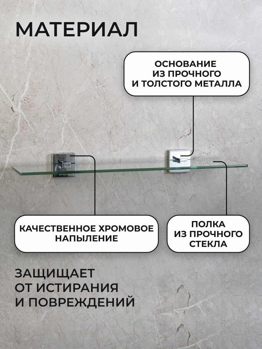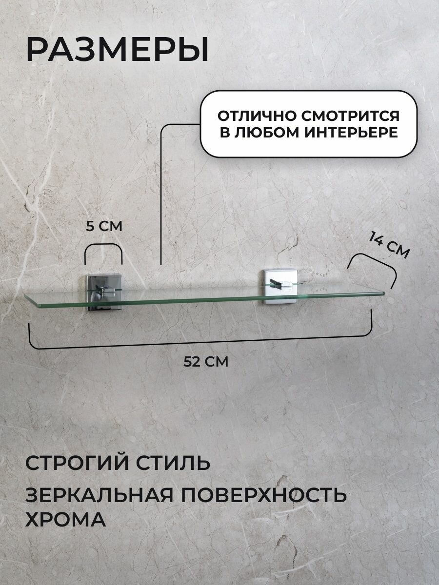 полка стеклянная, монтаж: настенный. Ширина: 52. Высота: 5 см. Глубина: 14 см. Метод крепления: шурупы. Тип рисунка: без рисунка. Фактура: прозрачная. Форма: прямоугольная