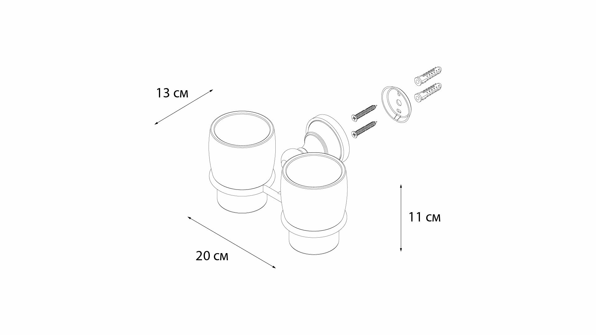подстаканник двойной, монтаж: настенный. Ширина: 20. Высота: 10,1 см. Глубина: 13,5 см. Метод крепления: шурупы. Тип рисунка: узор. Фактура: гладкая. Форма: круглая