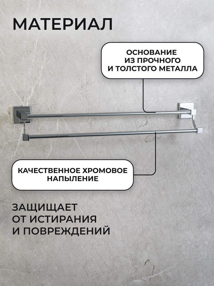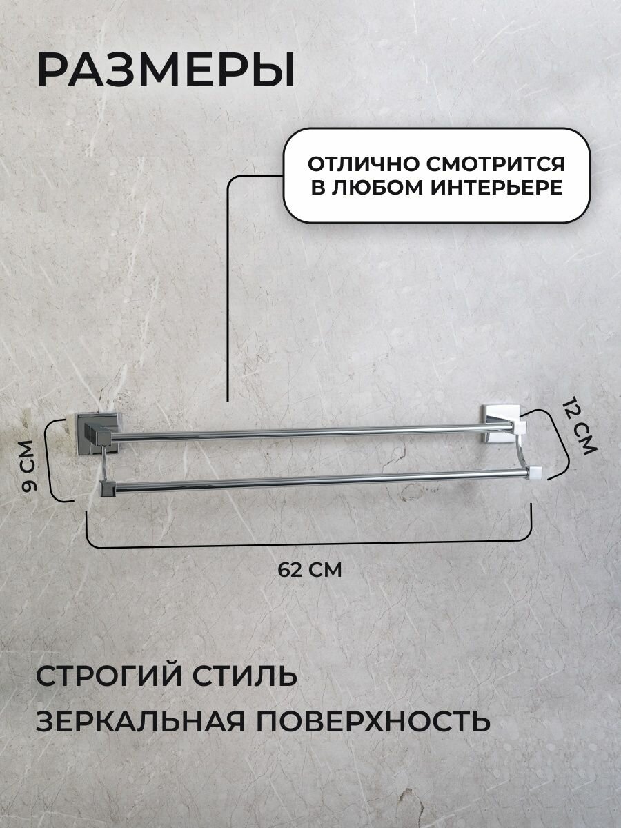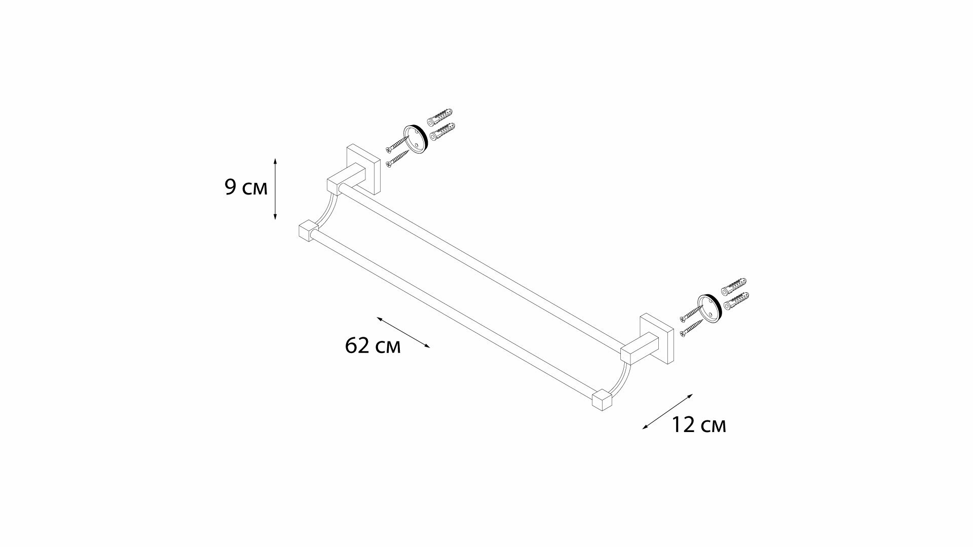 полотенцедержатель трубчатый 2-ой, монтаж: настенный. Ширина: 62. Высота: 9 см. Глубина: 12 см. Метод крепления: шурупы. Тип рисунка: без рисунка. Фактура: гладкая. Форма: прямоугольная