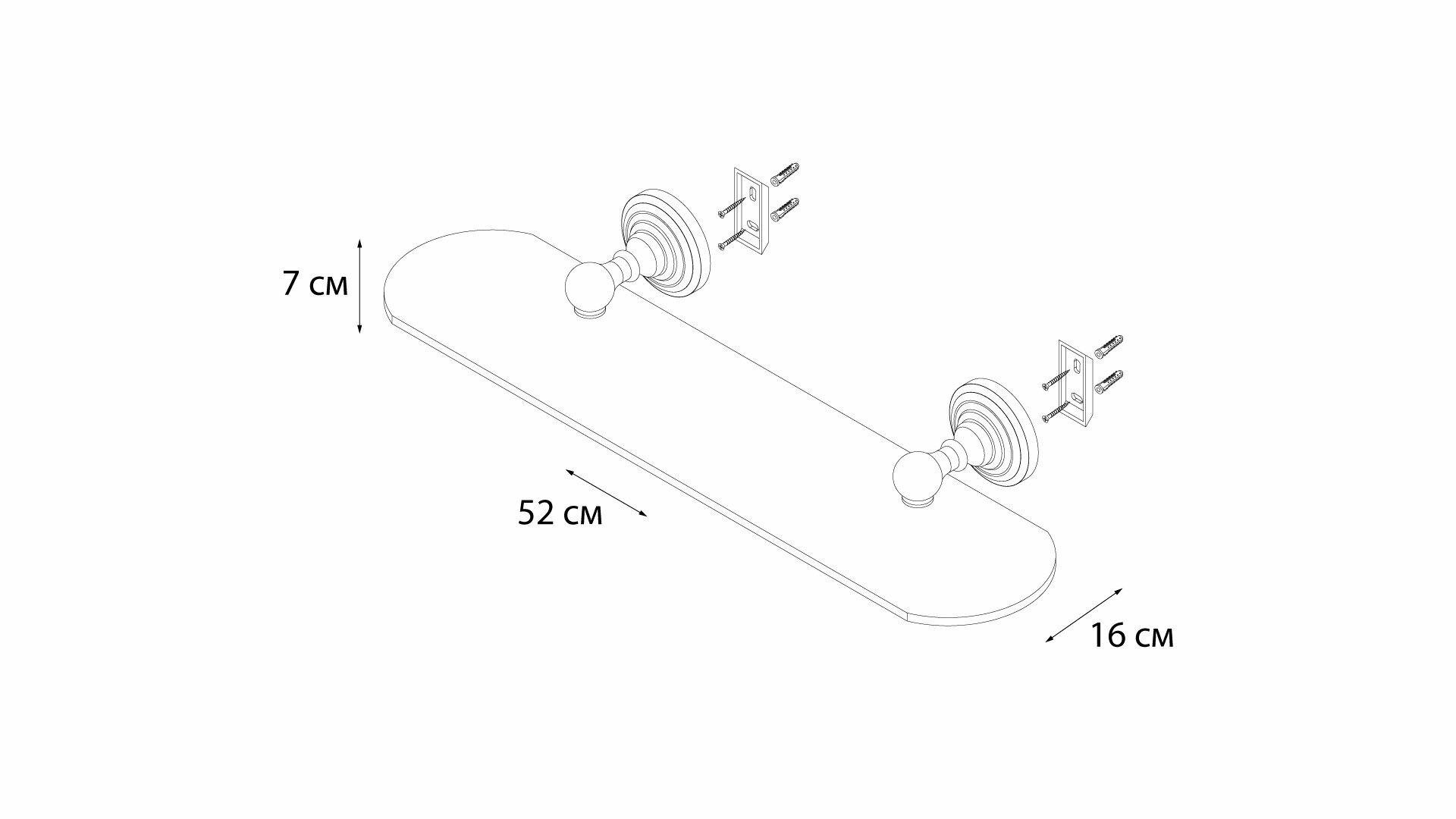 полка стеклянная, монтаж: настенный. Ширина: 52. Высота: 6,2 см. Глубина: 14,7 см. Метод крепления: шурупы. Тип рисунка: без рисунка. Фактура: гладкая. Форма: округлая