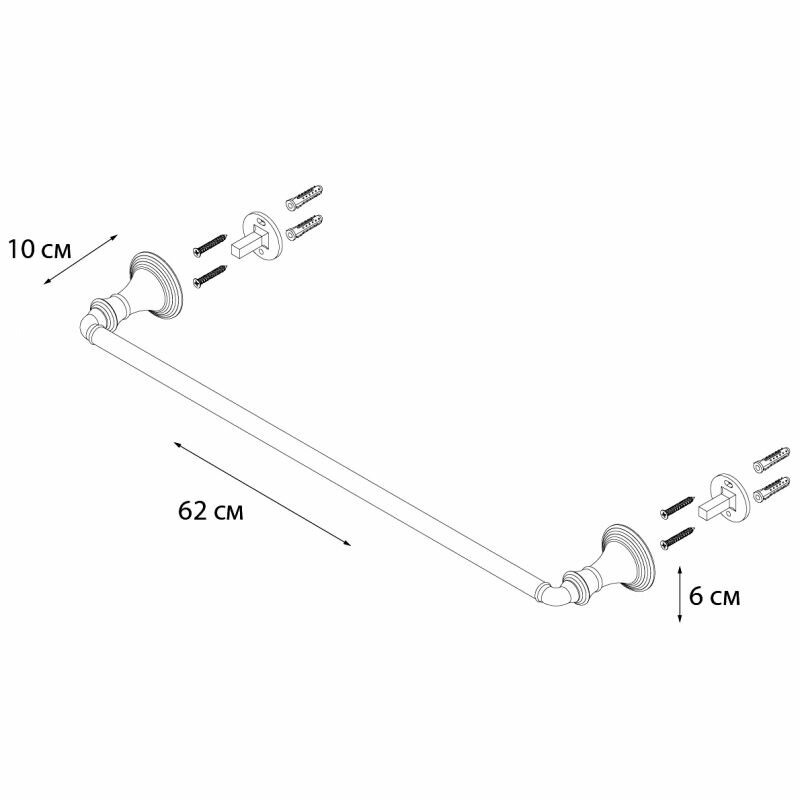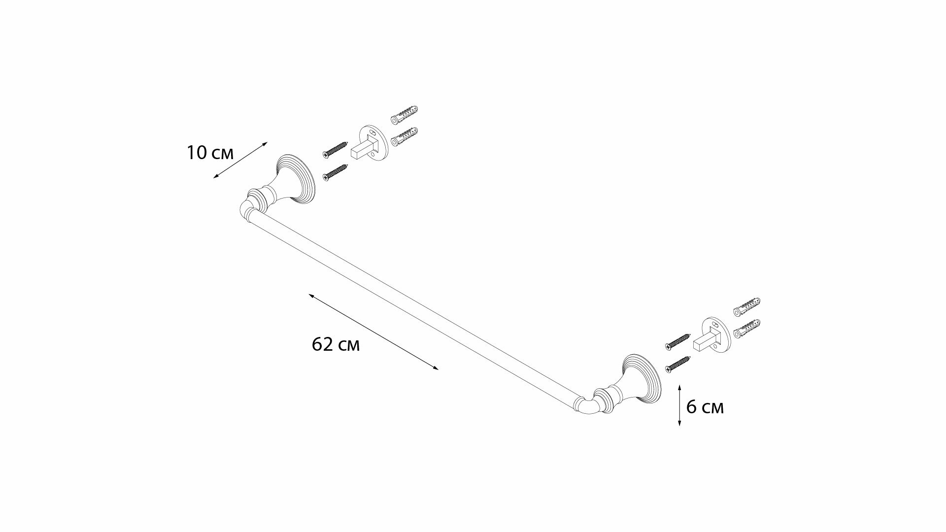 полотенцедержатель трубчатый, монтаж: настенный. Ширина: 62,5. Высота: 6 см. Глубина: 9,5 см. Метод крепления: шурупы. Тип рисунка: без рисунка. Фактура: гладкая. Форма: округлая